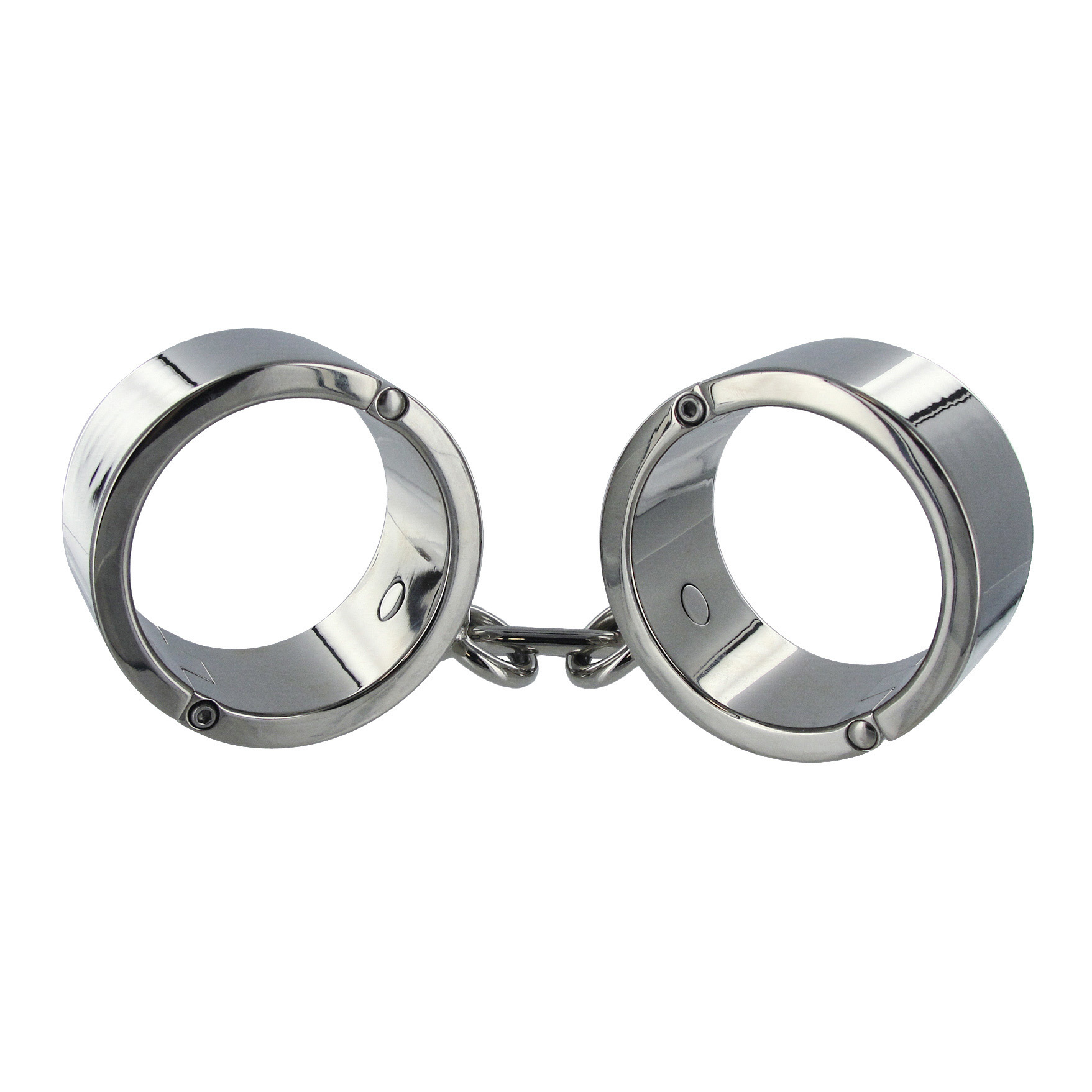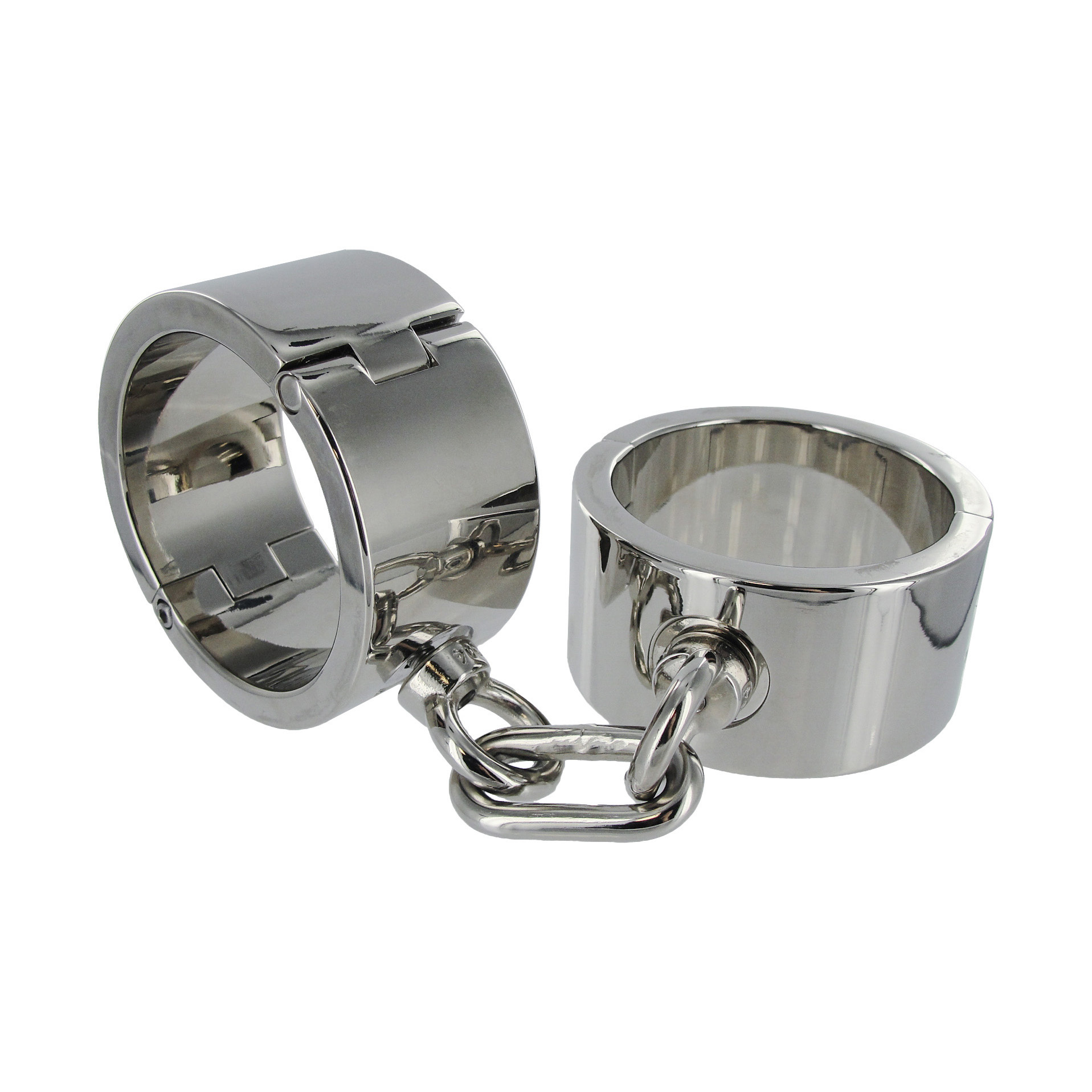 Your slave has but one purpose: to please you. These stunning hinged chrome wrist shackles will ensure that their subservience is as visually gratifying as it is in all other ways. Enjoy the look of these premium, weighty cuffs glittering at their wrists while they perform their submissive duties. A short, hefty chain tethers the shackles together to prevent excessive mobility and enhance your control. A hex key is included for securing or removing the cuffs. Enjoy this piece of bondage jewelry in all of its inescapable beauty. Measurements: 2.54 inch inner diameter, 7.99 inch inner circumference, chrome bands are 1.6 inches wide and 0.37 inches thick, connecting chain provides 3 inch max distance between cuffs, Material: Chrome plated steel, Color: Chrome