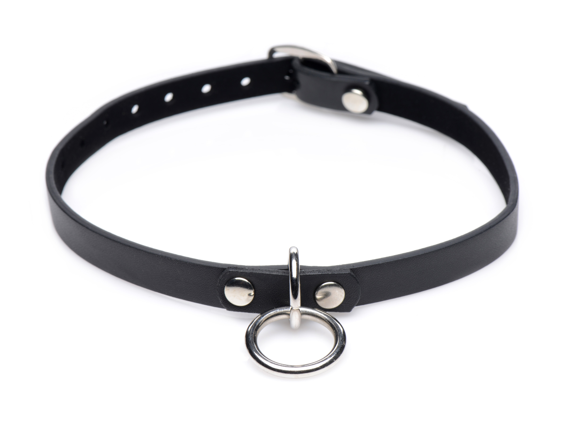The Silver O-ring accent fits leashes, restraints, and tags to lead and label your lover, crafted to be shiny and eye catching without standing out for a subtle bondage flair. The pitch black collar is made with durable PU leather and is only 0.5 inches in width, fit for most body types.