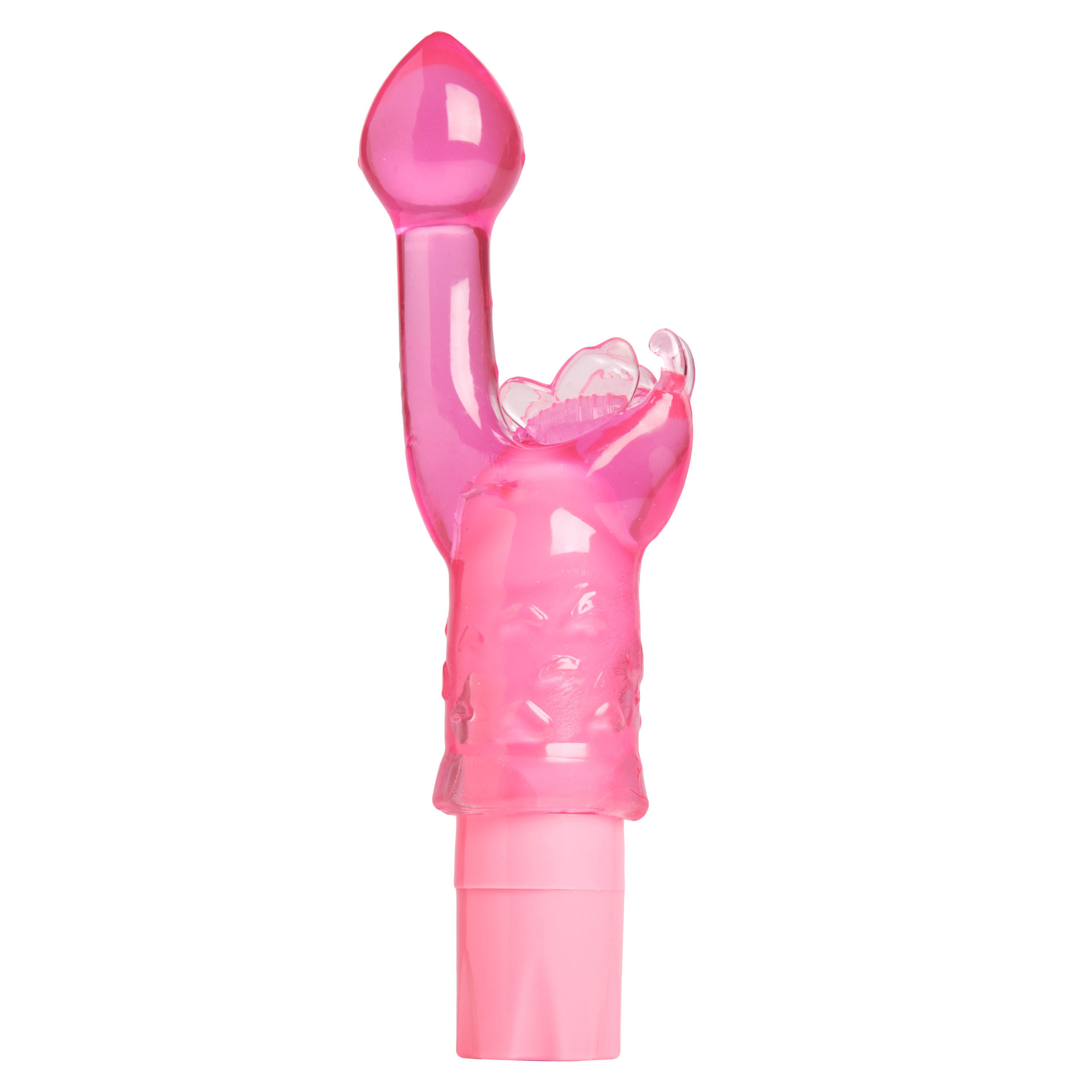This exciting double stimulation vibe will kiss your clit while the curved G-spot arm carries the thrilling vibration deep into your core. The material is slick and firm, yet flexible enough to curve with your body. The delicate clitoral stimulator has two exciting wings and antennae, with a textured pad for all-over pleasure. The swelled tip and demure size makes it ideal for all size preferences and experience levels. Just press the button at the base and enjoy powerful vibration, inside and out.