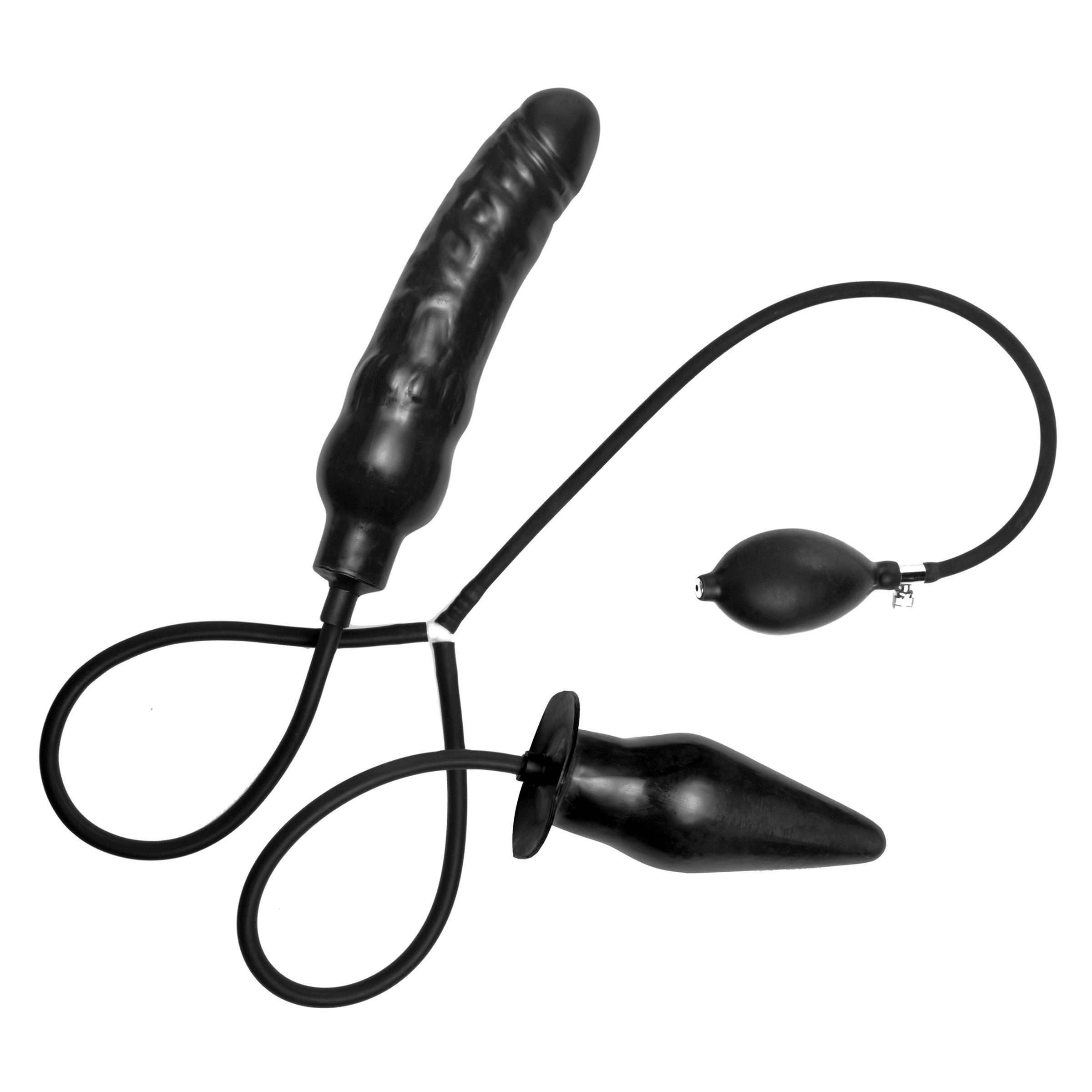 This inflatable dildo and anal plug set provides twice the expanding pleasure, and adds a new dimension to your play. Use it as a double penetration toy for you, or stretch the orifices of you and your partner simultaneously. Both expanders are semi-rigid and controlled by the same bulb. There is a quick release valve on the side for easy and fast deflation. The dildo has a semi-realistic look and texture, while the plug features a classic spade shaped design with a flared base and tapered tip. Each is designed to be used only while air is inside, there is no firm core, so you can control how soft or hard each is by adjusting the air levels in each.