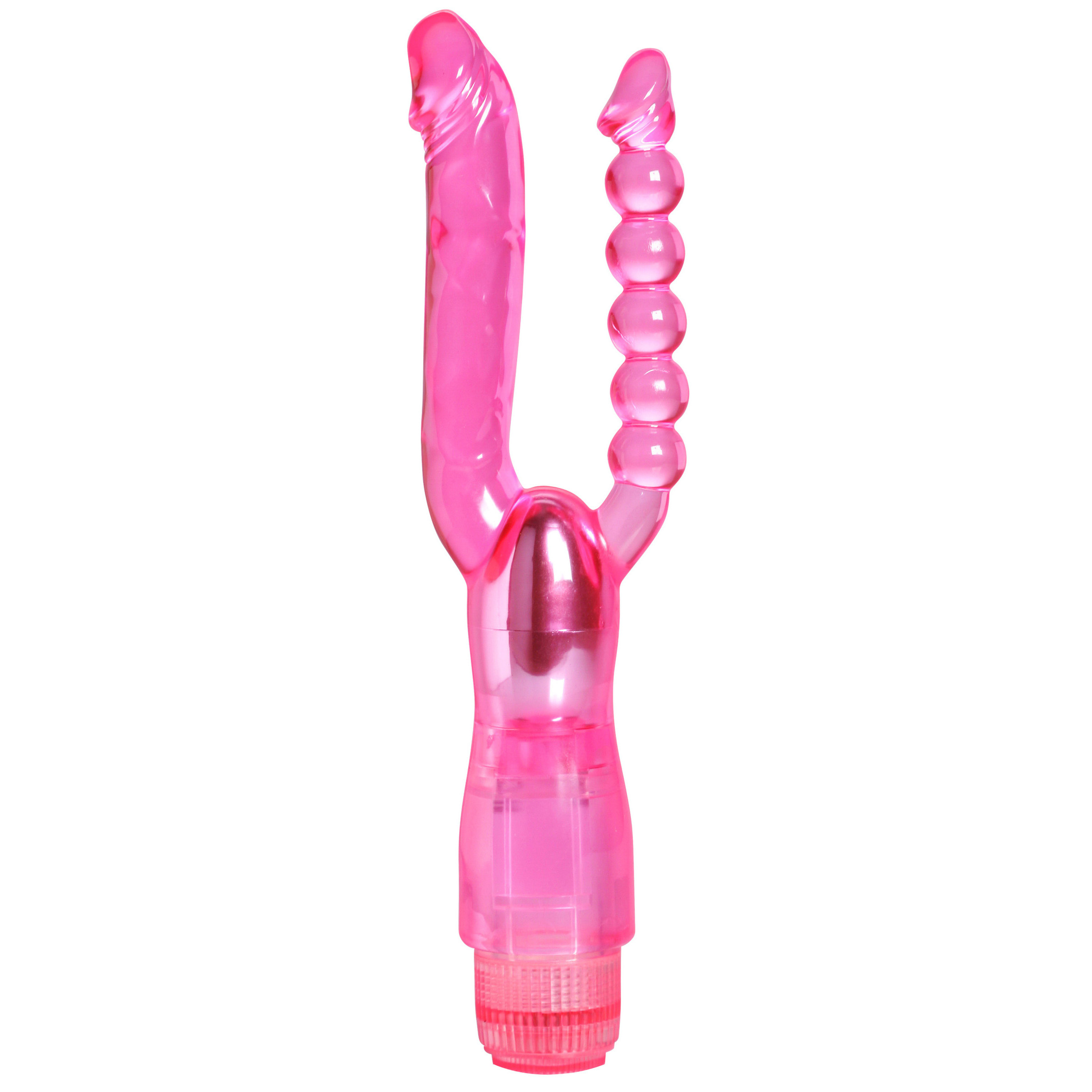 Stimulate simultaneously with this variable speed, pleasantly pink vibe! Featuring a semi-realistic insertable dildo as well as a beaded anal stimulator. Made of flexible TPR material so it bends within the body, and powered by an intense motor. Once you turn on this sexy vibe, you will have double the orgasm inducing pleasure at your fingertips.