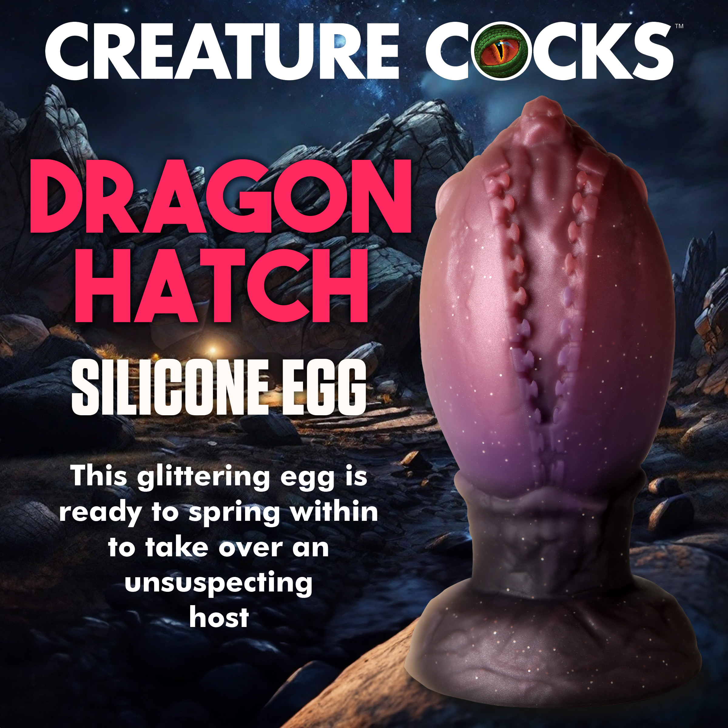 Become the Queen Mother of Dragons or the King of Dragon Eggs! This Dragon Hatch egg has begun to crack open and reveals a small, baby dragon beginning to escape! The glittery, dark red and brown egg is textured with zipper-like ridges along the crack of the egg and a tapered, dragon-head tip! The tapered tip helps you insert it and the round, wide, squishy body gives you a satisfying fill! Enjoy laying the egg as you push it out post-penetration! The egg is made from premium, phthalate-free silicone and is plush, silky smooth. Use only with water-based lubricants. After use, wash with warm water and mild soap then rinse and spray with a toy cleaner. Store in a cool, dark place.
