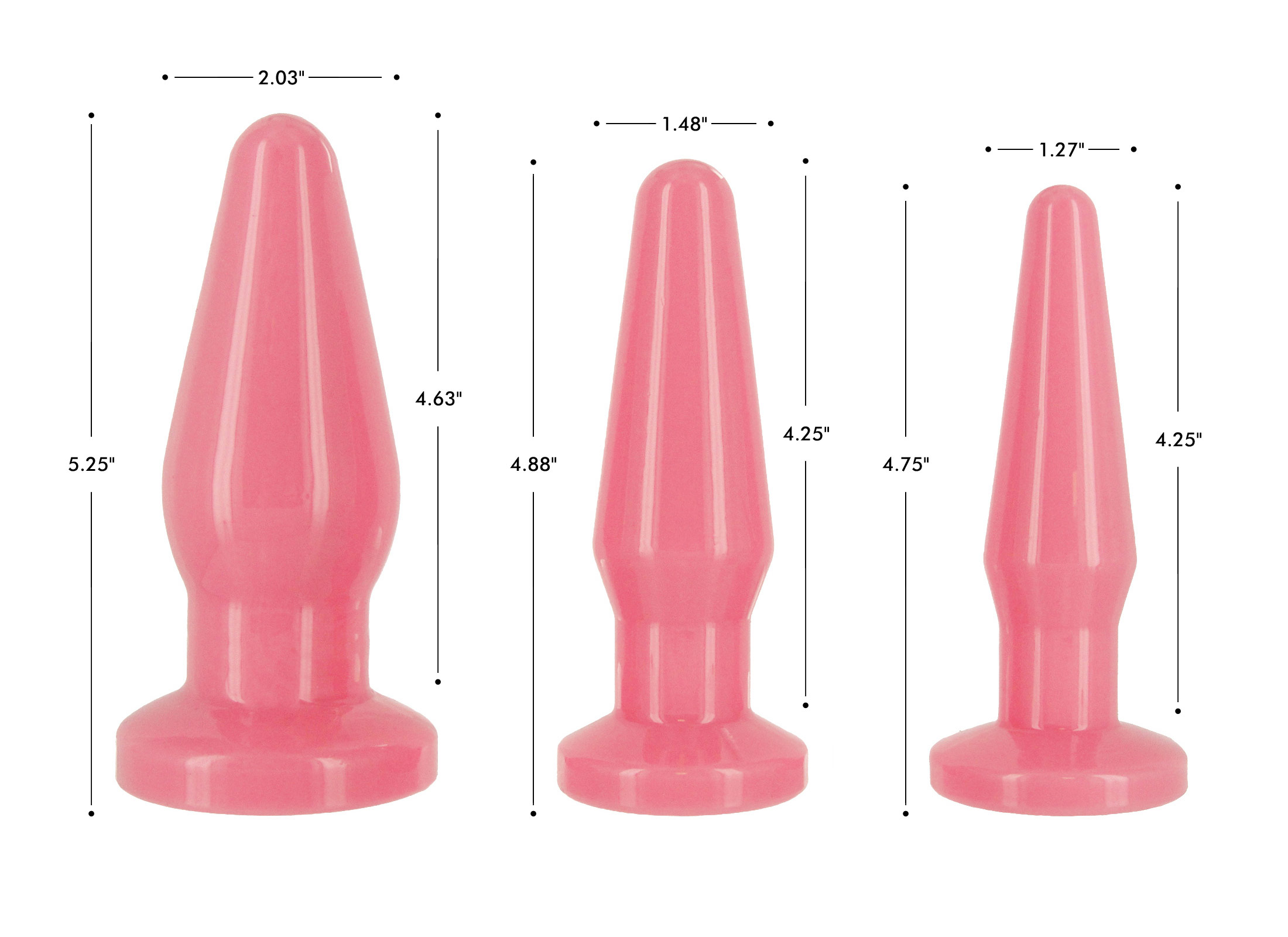 Fill-er-Up! This set of graduated butt plugs is the perfect kit for anyone ready to experiment with anal play. Each plug is gently tapered with a rounded tip to allow you to slowly work up accommodating a larger sized anal toy. Grab some lube, go at your own pace, and let the smooth surface glide in, gently expanding you. The plugs narrow down to a smaller stem after you make it past the widest point, and a wide base keeps your toy in place and lets you easily retrieve it. The glossy pink material is slightly flexible, yet firm, and provides a playful visual appeal as you challenge yourself to move up from one size to the next.