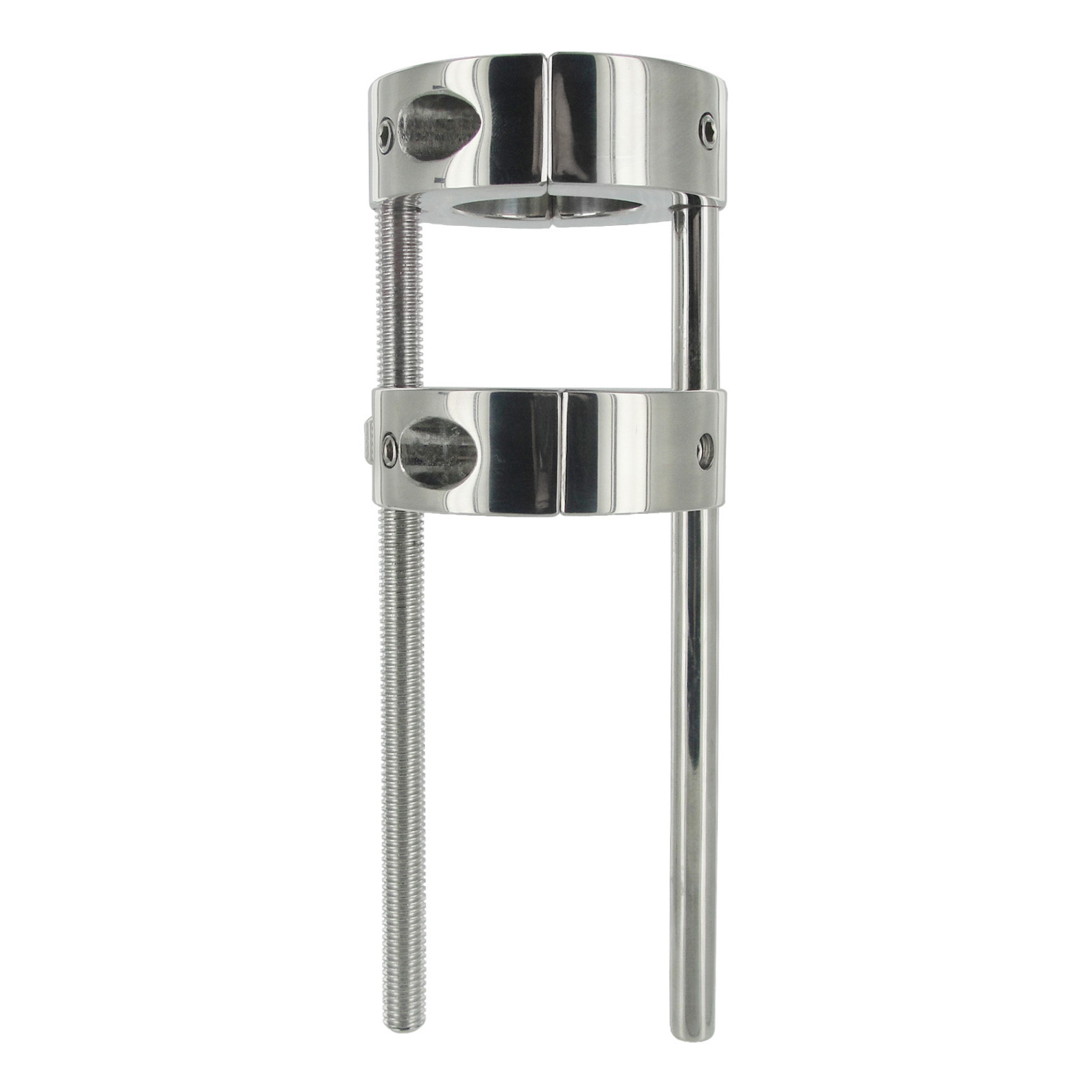 Maintain a pleasant tug on your balls or experience a tortuous extreme stretch with the fully adjustable Hells Bridge Ball Stretcher. With the two stainless steel rings side by side, place your balls through the openings and lock the rings closed with the included hex key. Now that both rings are secure around your sack, you can begin to rotate the nut on the side of the outer ring, causing the rings to draw farther apart. Take the stretch as far as you can stand it For further torment, use the hex key to tighten down the internal screw points on each ring to introduce additional points of pressure to your stretching scenario. The Hells Bridge also doubles as a ball crusher, when you place only the inner ring around your scrotum and lower the outer ring gradually to achieve a relentless crush. Measurements: Item has 6.38 inch overall length, Rings have 1.32 inch inner diameter, 0.86 inch thickness, 4.88 inch max distance between rings, Adjustable Screw Points protrude up to 0.25 inches into rings, Material: Stainless Steel, Note: Hex keys included