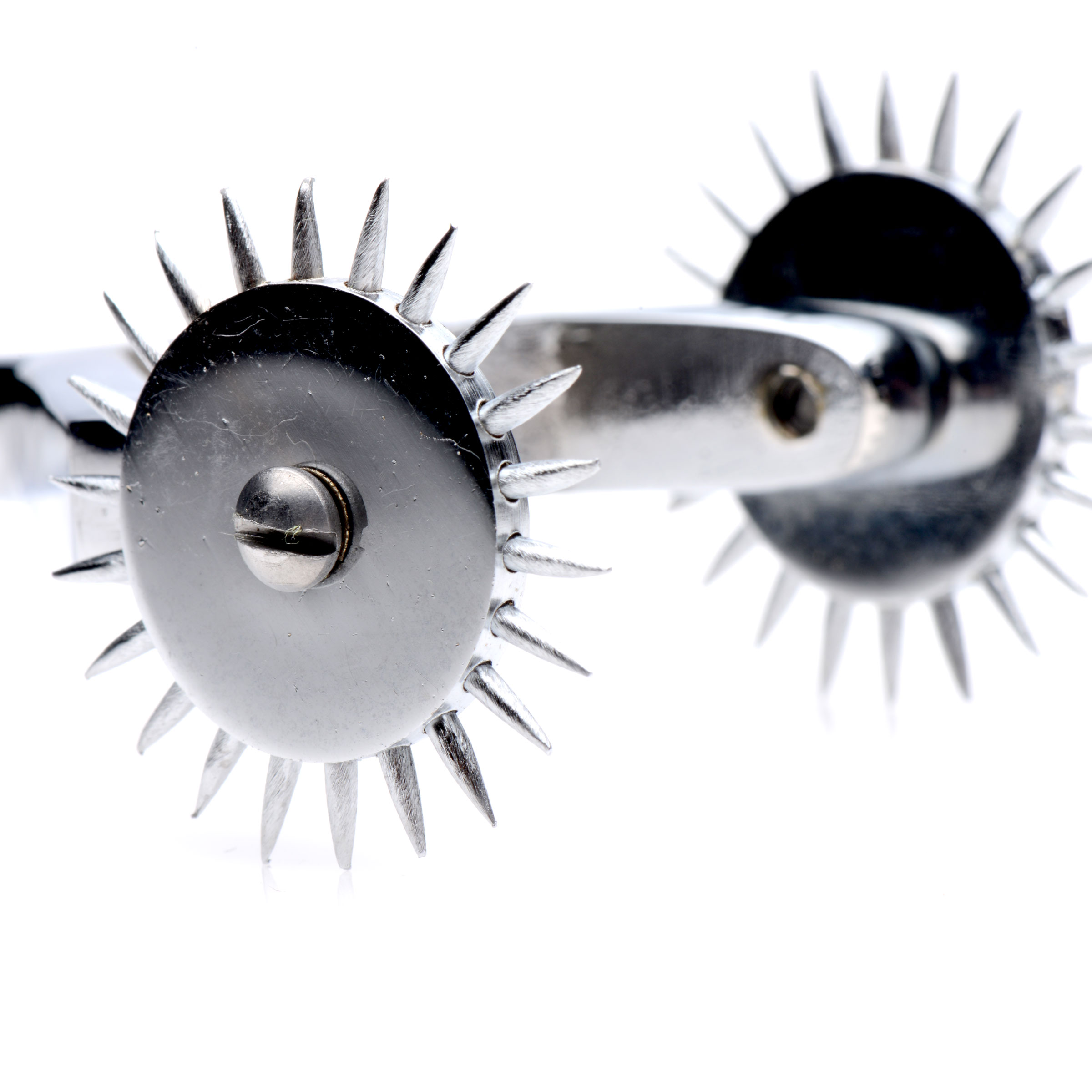 This attractive and exciting take on a Wartenberg Wheel is made of heavy-duty stainless steel, with two spinning heads to tease and please your lover with. The handle is slightly indented on either side for a comfortable and secure grip between your fingers during use. Glide the instrument across your partners chest or up their thigh to send shivers through their whole body. The wheels spin smoothly, sharp pin-pricks leaving a trail of sensation in their wake.