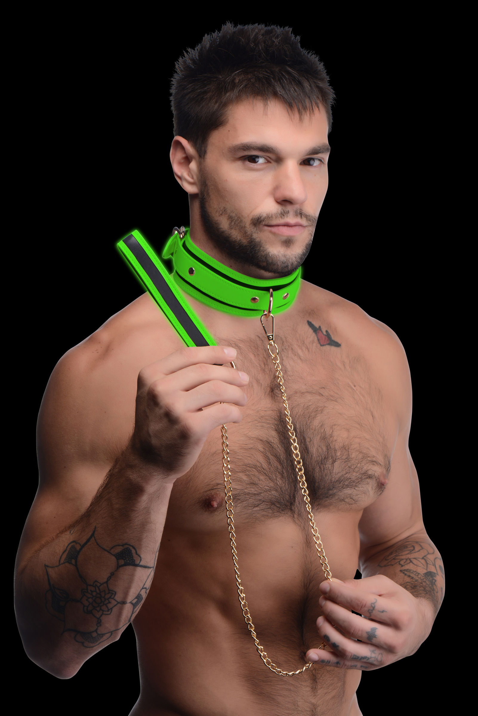 Lead your sub around and control their movement during sex with this glowing collar and leash set! Made with a sturdy white PU Leather with gold metal hardware for elegance and durability - adjustable to find the perfect fit with a generous amount of gold chain.