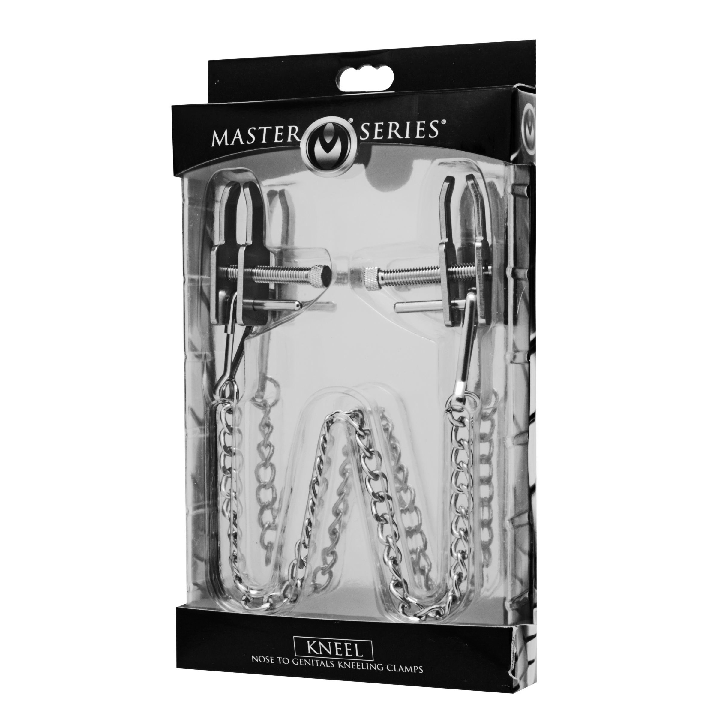 Restrict your submissives movement entirely when you clamp their nose to their genitals with this unique set! Thumbscrews allow you to adjust the pressure on their sensitive parts from teasingly light to extreme! The pinching pleasure will satisfy any level of masochist. You are only limited by your own imagination with this set. Keep them in kneeling position, or put them on their back. Use the clamps on their nipples or any other body part! The chain disconnects entirely so you can even use the clamps independently if you want! This versatile clamp set will keep your pain-lover at your knees and begging for more.