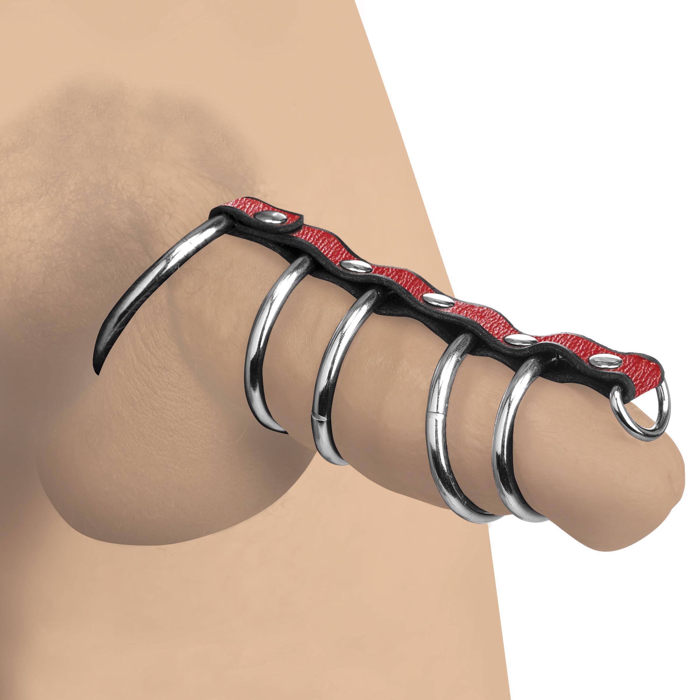 Graduated Constriction Rings: This cock ring extends out along the shaft using 5 graduated restriction rings that support and restrict the shaft while hard.Metal Pull Ring: The metal O-ring attached to the cock ring is perfect for adding to a sexy aesthetic but can also be attached to a leash in order to be led around by the genitals.Real Leather: The strap is made of real leather that will stretch and adjust for a custom fit.Nickel-Free Metal: The metal rivets and rings are nickel-free and body safe.