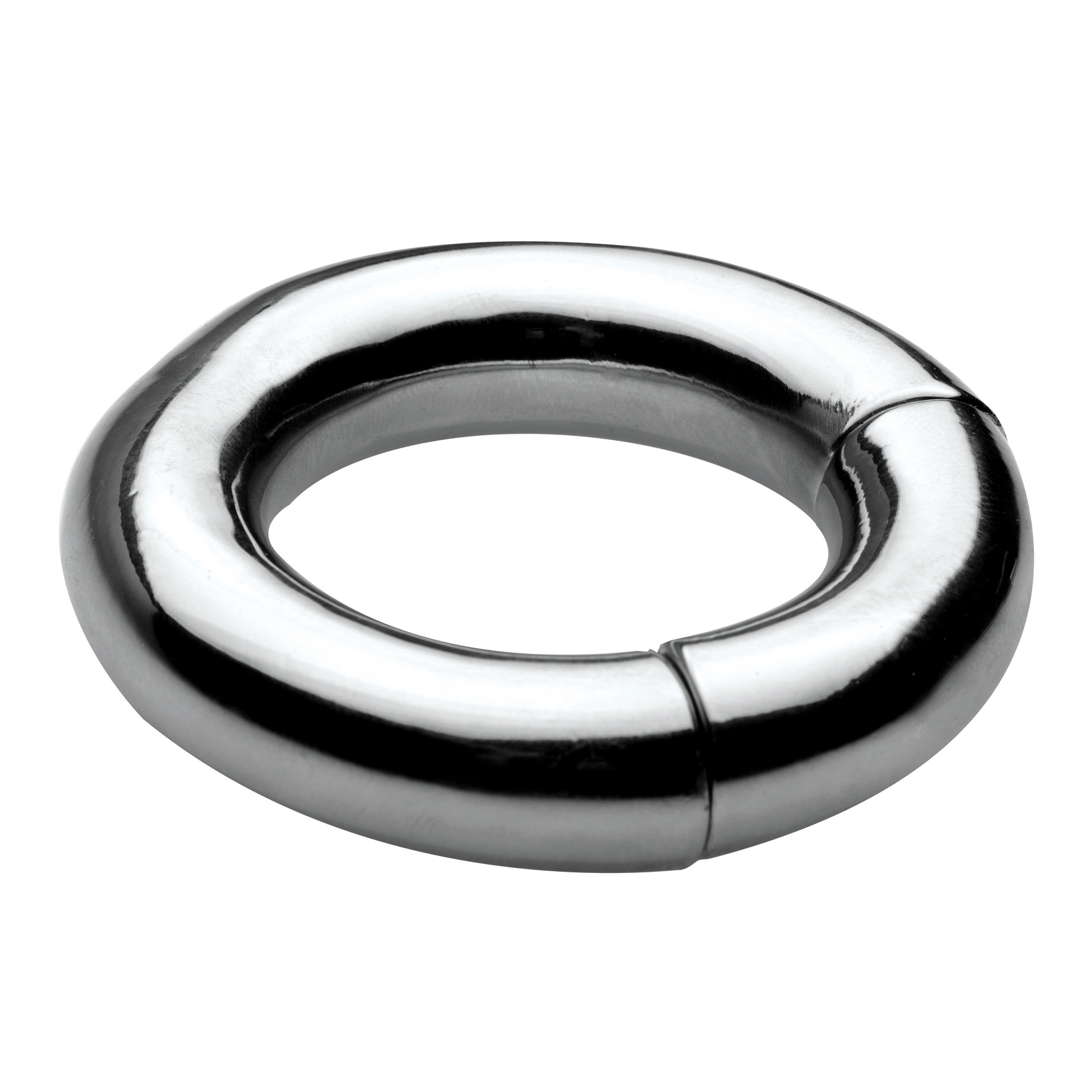 Weighing in at a whopping 6.4 oz, this ball-stretcher will get the job done simply with the sheer force of gravity Made of highly durable stainless steel, this heavy ring will pull down on your scrotum to create a unique sensation that will amplify a sexual experience on your own or with a partner. The powerful magnetism within the ring allows it to easily open and securely close. This attractive and distinct accessory is compatible with all types of lubricant and cleans with mild soap and warm water. Measurements: Inner diameter is 1.5 inches. Material: Stainless steel. Color: Grey.