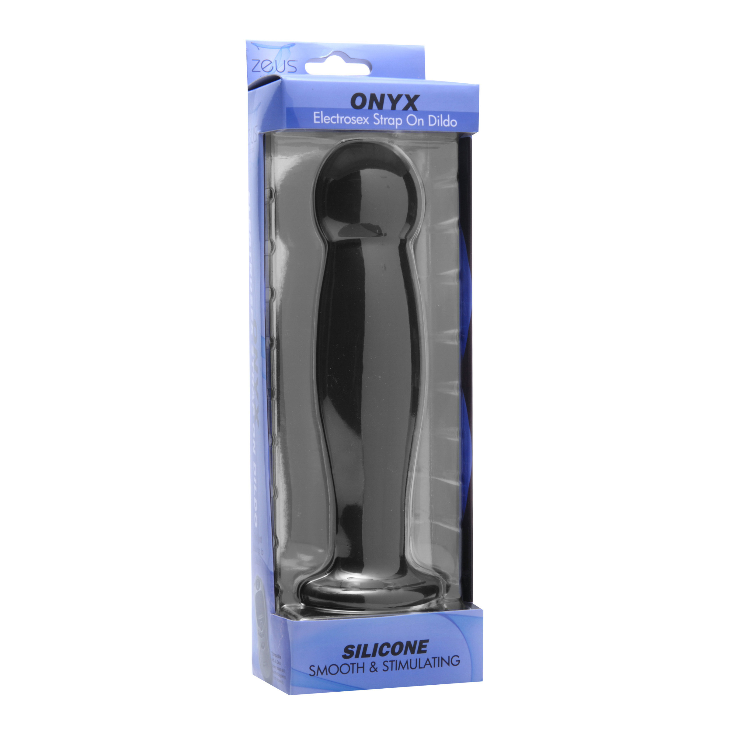 The Onyx Silicone Electro Strap On Dildo by Zeus is amply sized to satisfy your need for a fulfilling electro adventure! Perfect for the daring novice or seasoned users alike. Made of premium silicone, it features a bulbous tip and flared base, ideal for use in most strap-on systems. Once inserted, electro stimulation will flow from one conduction pad to the other. Simply plug into any Zeus Electrosex Power Box, sold separately. The leads attach to the sides, rather than the base, to ensure they will not get in your way. The electro wires fit nicely outside of O-ring connectors.
