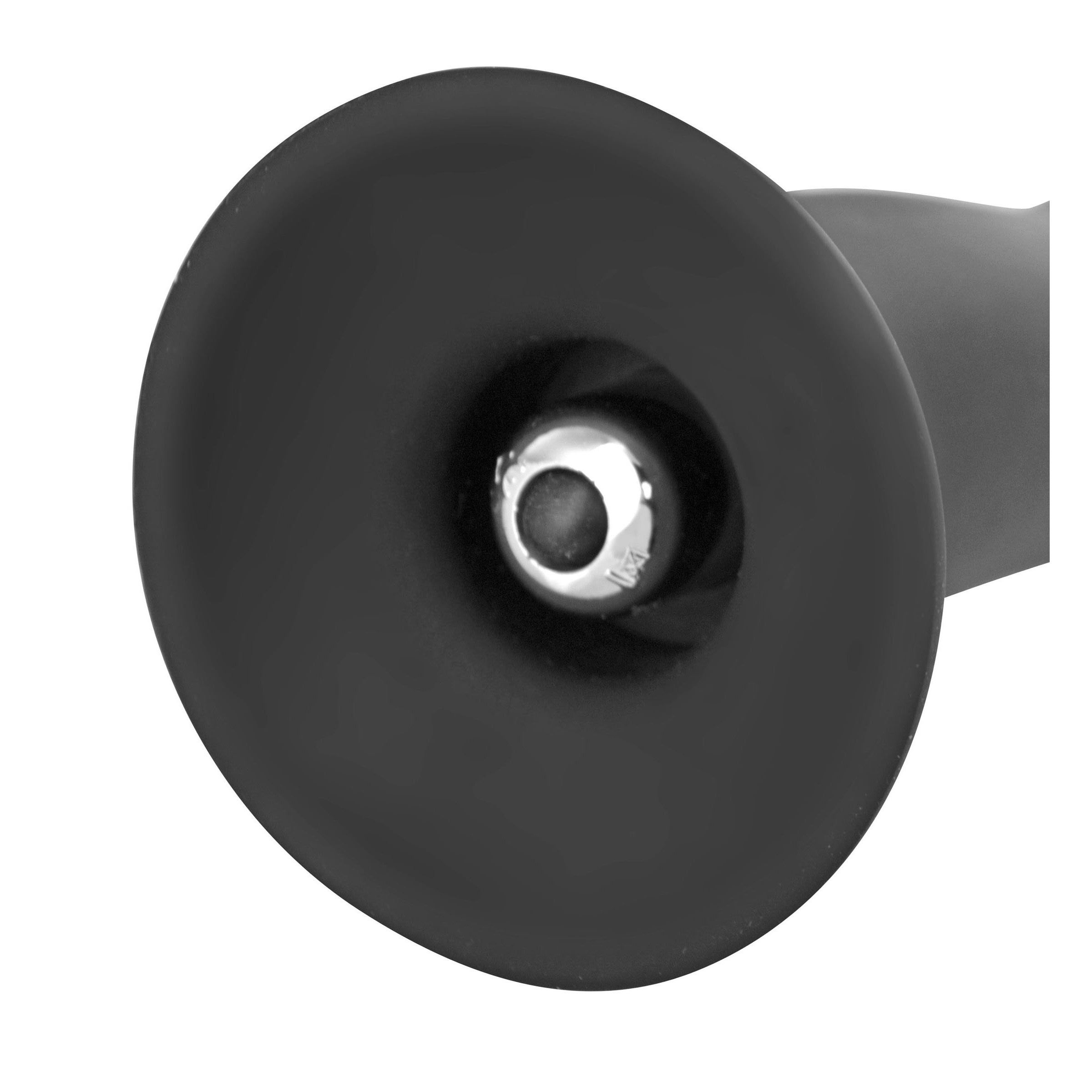 This curved silicone vibe has a smooth shaft, arched cock head, and flared base for perfect strap on play. The powerful bullet is housed in the base, with an easy one-touch control that tucks safely out of the way during use. The tip is specially curved for maximum G-spot stimulation, with a smooth silicone shaft. The firm yet flexible material is body safe and easy to clean, with a soft matte feel. Works with most standard strap-on systems, sold separately.