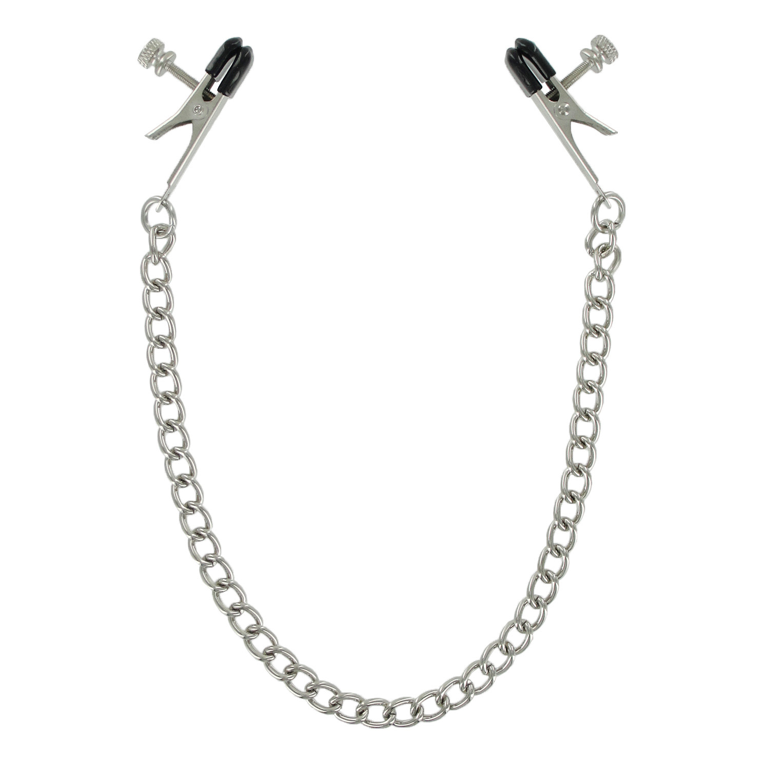 Attached to a single chain, once these bullnose style clamps are affixed to the nipples of your plaything, you can control just how much pleasure or pain they deserve. Simply adjust the level of intensity by turning the screw located near the tip of the clamp. Tips are coated in vinyl for added comfort and safety.