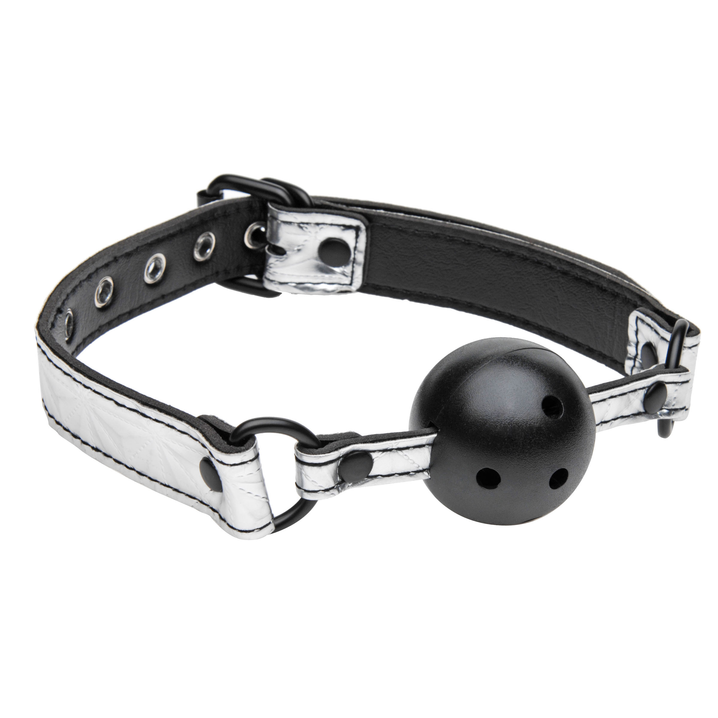 This perforated gag lets you restrict the speech of your plaything while still allowing them to breathe easily. The smooth plastic is tasteless and odorless, and large enough to gag them without being uncomfortable. The sexy embossed outer design is lined with soft, padded neoprene and is accented with black, nickel free hardware. The strap is fully adjustable, and closes with a rolling buckle. Measurements: Adjusts from 15 to 22 inches around, ball measures 1.85 inches in diameter Material: Vinyl, plastic, neoprene Color: Silver