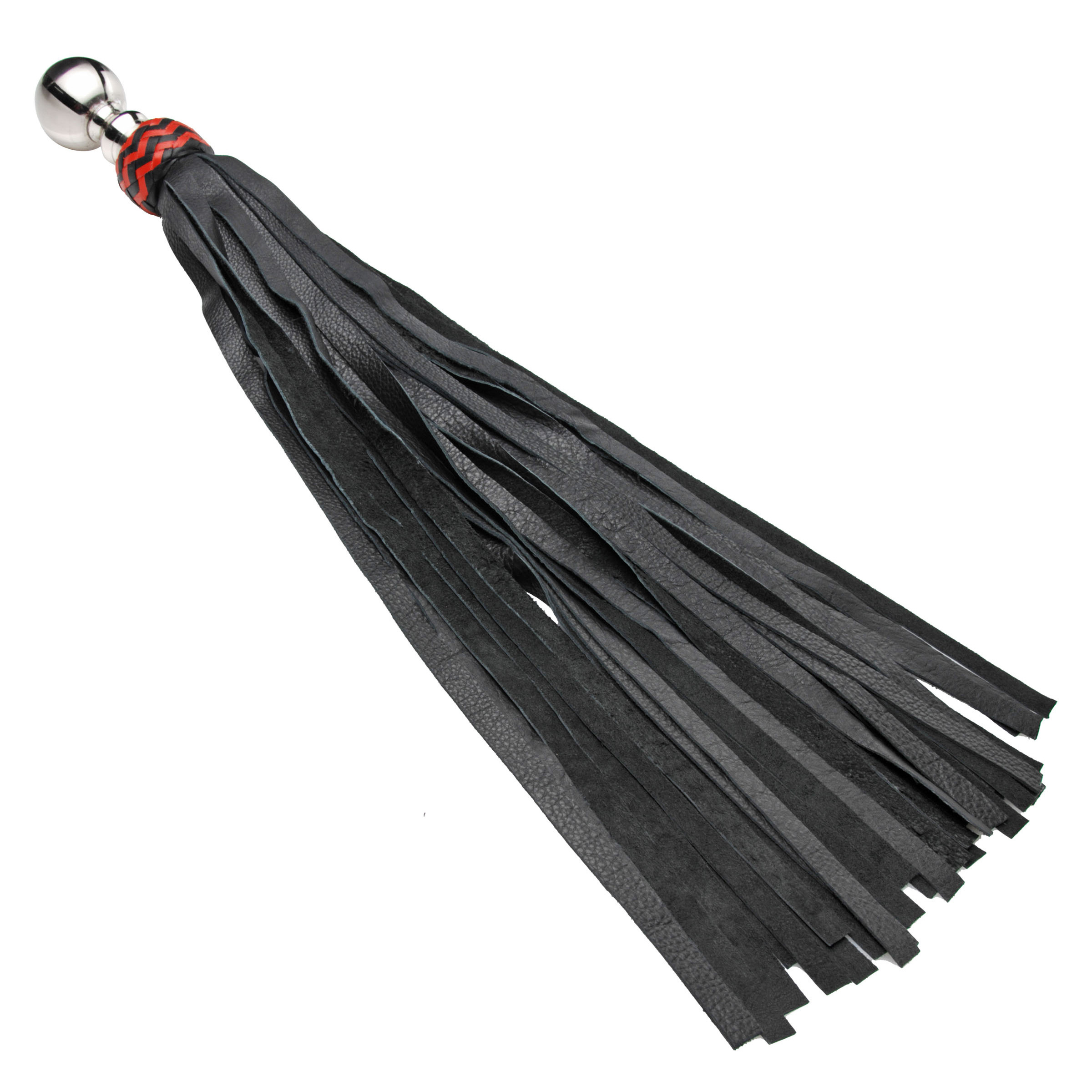 This fine leather flogger has a polished ball handle for more freedom of movement with an elegant design. Made to fit neatly in the palm, the metal handle allows you to swing in wide arcs, so you can choose the type of impact you desire. The high quality leather falls have a prominent grain, with a luxuriously soft yet substantial feel. The ends are flat tipped for a unique sensation, and the entire piece is weighty and made to last. Measurements: 26.5 inches in length, 2.15 in diameter Material: Leather, metal Color: Black