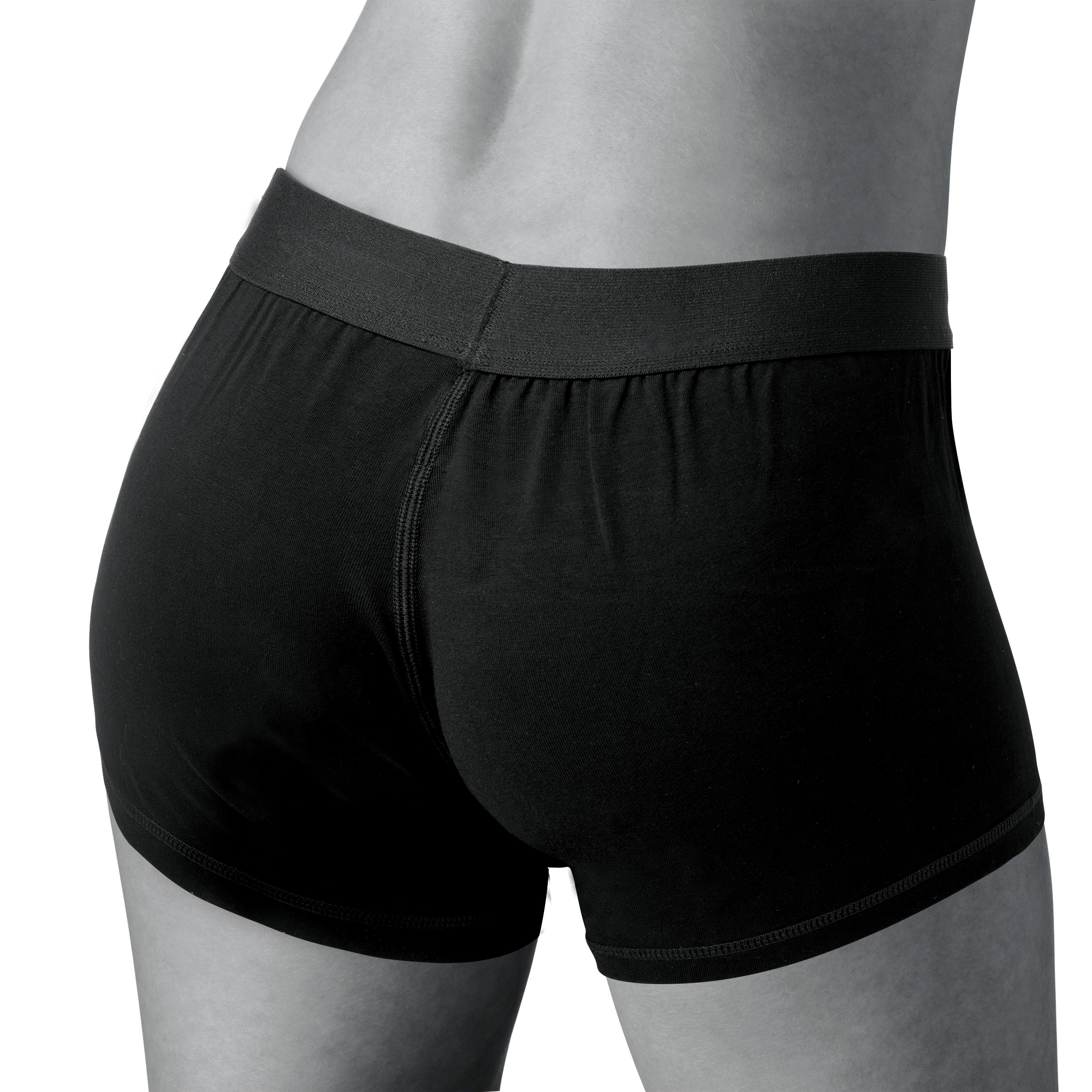 These comfortable boxer-briefs have a built-in O-ring that will securely support most harness-compatible dildos. The full-coverage design is modern and sexy, without appearing overly feminine. A pocket sewn into the crotch will accommodate a small bullet vibrator to pleasure the wearer. The wide waistband stretches to fit a variety of sizes. A seam running up the bum provides an attractive separation between your cheeks. Made without leather, it is both vegan-friendly and machine-washable. You never need to compromise your comfort or personal aesthetic with this strap-on harness. Curve Toys is known for their ultra-realistic bio-skin formula used to create the best dildos and adult toys in the world. They manufacture their adult replica products with USA materials that are body-friendly, phthalate-free, and top-grade. Their proprietary blend of bio-skin is mixed in-house, making them a leader in sexual health. All products are inspected for superior functionality so that they represent the value, quality, and innovation from the factory to the bedroom. Staffed by experts with over 60 cumulative years in the adult manufacturing, Curve Toys is the perfect combination of passion, creativity and experience; in short, we know pleasure. Measurements: Waistband measures 26 inches in circumference unstretched. Legs of shorts are 9.5 inches in length, unstretched. O-ring is 1.5 inches in diameter, unstretched. Material: Cotton, spandex, rubber, silicone Color: Black Note: Dildo sold separately
