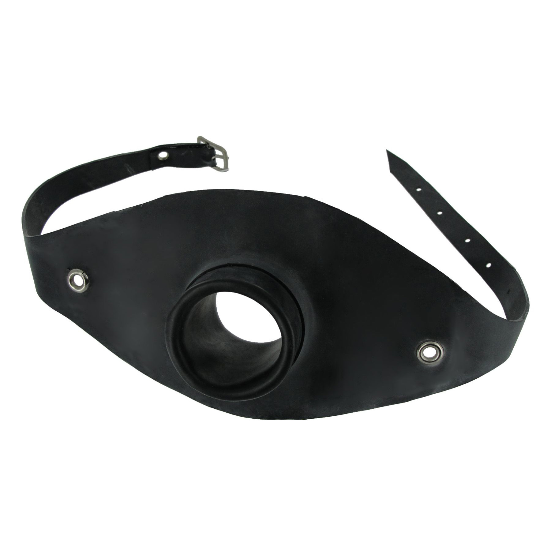 This is an excellent 100% rubber open mouth gag. The mouth piece is made of heavy rubber keeping the mouth from closing. The hole is a whopping 1.5 inches in diameter and protrudes 1 inch into the mouth. Measurements: Neck strap adjusts from 17 to 20.5 inches around, Gag tube has 1.5 inch inner diameter, and 1.85 inch outer diameter, Material: Rubber with Metal grommets and buckle, Color: Black