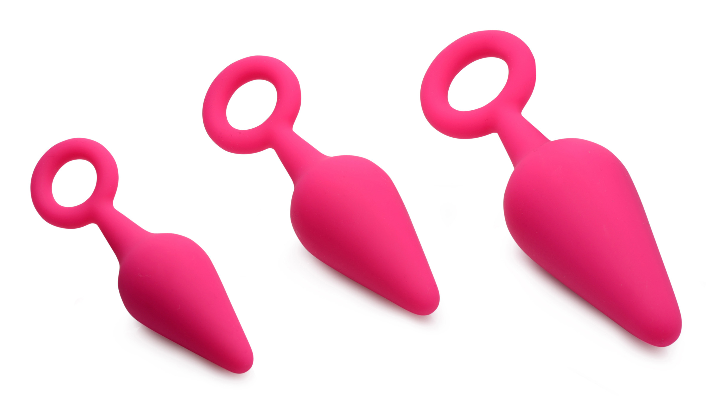 This graduated set of tapered butt plugs features ringed bases for safety and convenience! These Rump Ringers are slimmer and more petite - perfect for training or as dedicated anal toys, great for beginners and experts of anal play alike. The tapered tip makes it easy to insert and enjoy, while the flexible material and design keeps things comfortable so you can train you hole without worry.
