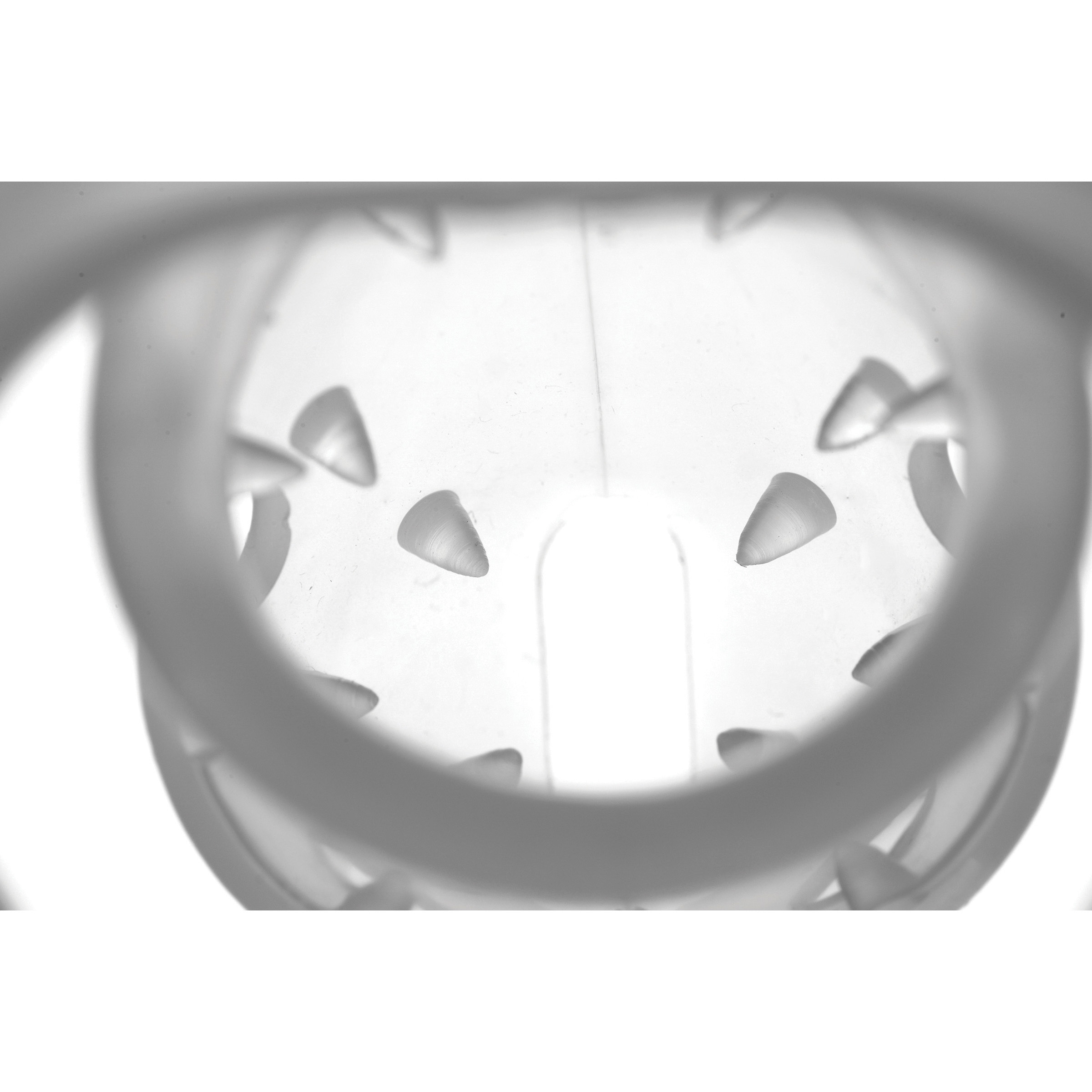 Satisfy your sickest desires when you put your slave into this sadistic chastity device! Tug his shaft and scrotum through the silicone ring and then push his cock into the spiked cock cage. The spikes are just hard enough to create the pain you want him in, without piercing the skin. Wrap the strap around the base ring and secure it in place with the white stud and lock. He will not be able to escape the evil confines of Sados Spiked Chamber! A cum-through hole allows him to urinate, making this device ideal for long-term wear. The premium silicone is non-porous and phthalate-free for a completely body safe experience.