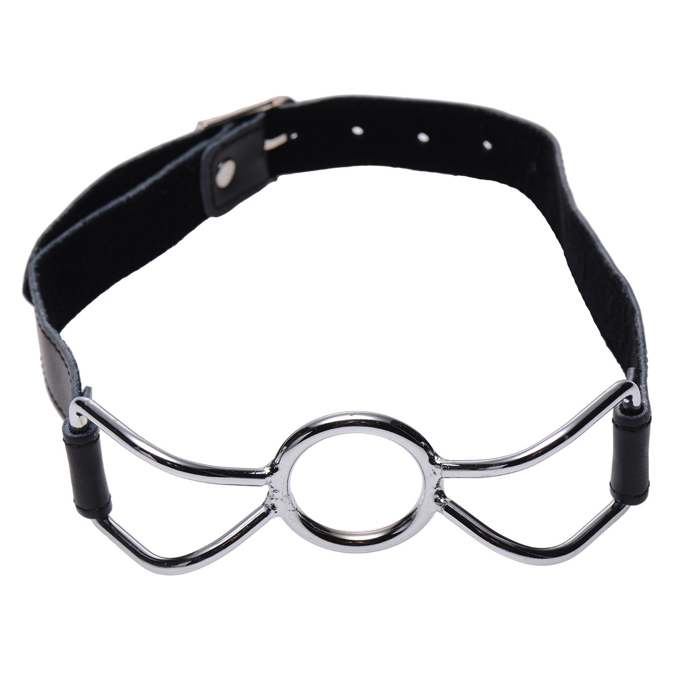 This gag leaves your partner speech-less while still having access to their mouth as it remains open! The gag will remain securely around their head with the belt style buckle. Because the strap is adjustable, it can fit a wide range of people. The gag part its self is an O shaped ring which measures approximately 1.75 inches in diameter, outside, while the inner hole is 1.3125 in diameter. The ring is welded onto two protruding rectangular shaped pieces onto which the strap is attached to. This gag will be very effective and comfortable for the handling of your sub.