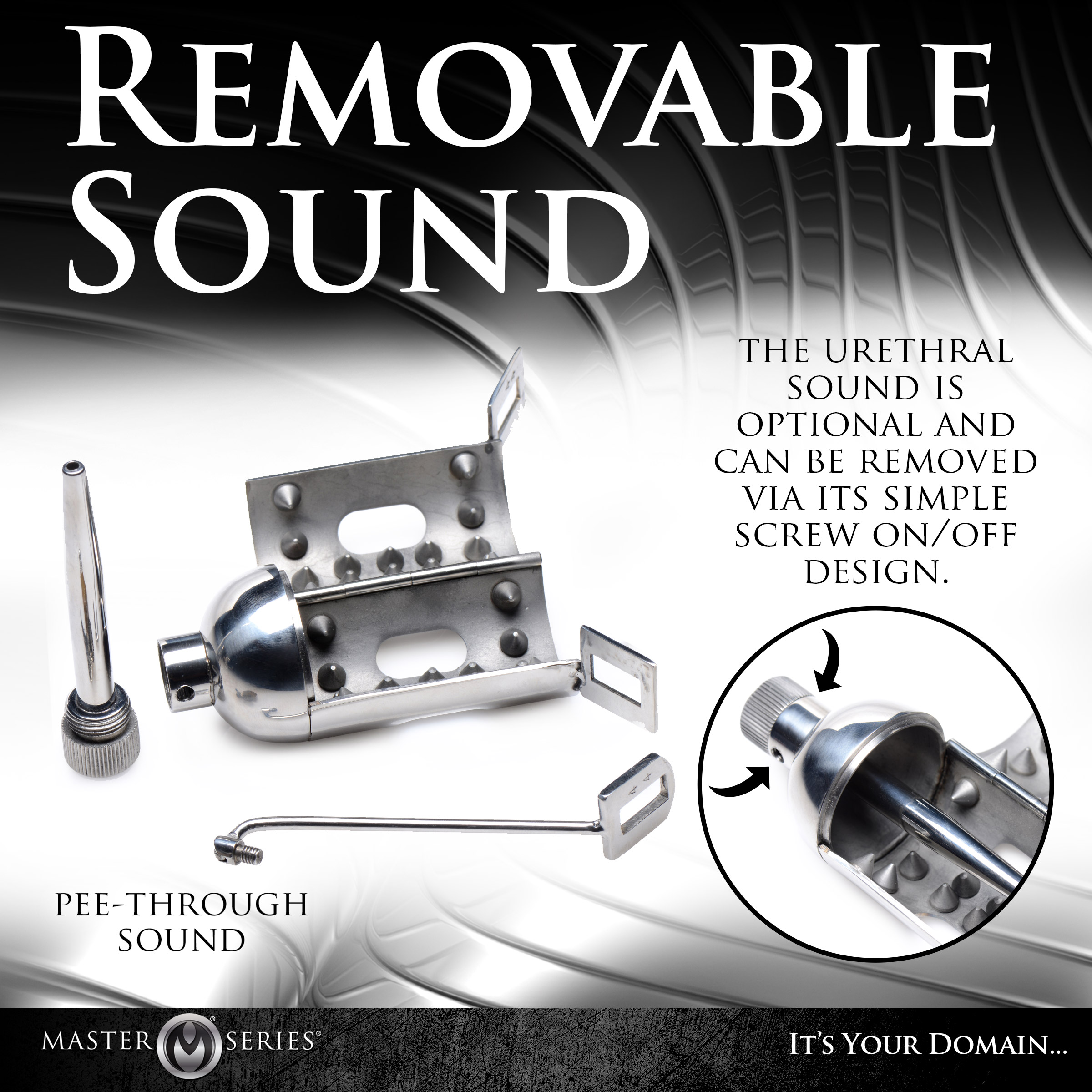 This maniacal chastity cage is built for the extreme! Lined with delicious spikes to bite on your dick while you are stretched from the pee-through sound. Squeeze your balls between the small space created from the included ball ring, and lock all three parts together with the included lock and keys and hand them off to your dom for complete submissions.
