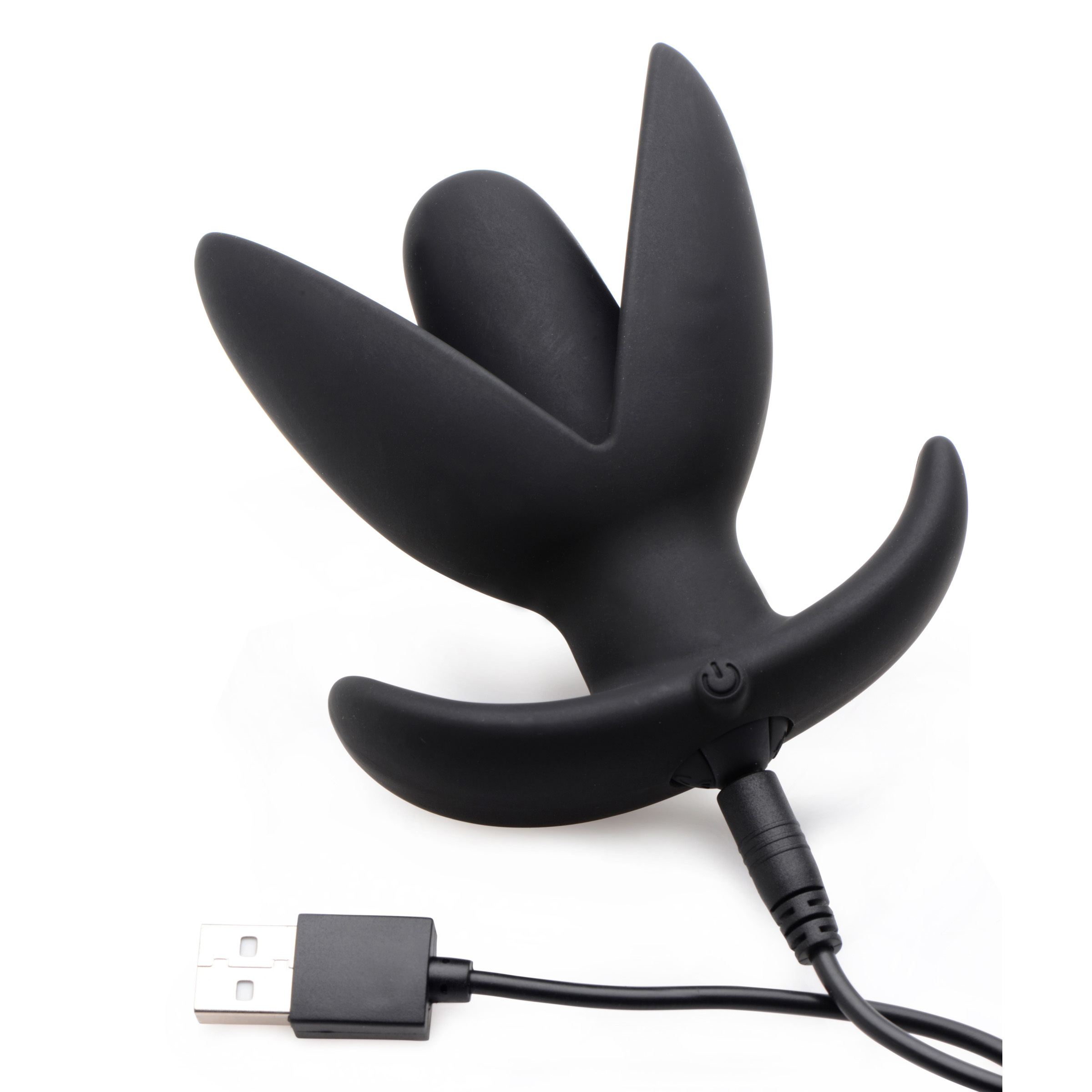 A smooth, manageable insertion that sprouts into a wide, anal invasion This unique anal plug pinches together for comfort while you push it into you, but opens up once it gets past your sphincter, pressing on your anal walls. Best of all, this rechargeable device has a powerful vibrating bullet embedded in it, causing it to thrum with 3 intense speeds and 7 exciting patterns. The ergonomically shaped base is ideal for long-term wear, fitting comfortably between your cheeks. Made of premium silicone, this toy is non-porous and phthalate-free. Clean with mild soap and warm water and avoid use with silicone lubricants. Measurements: 4 inches in total length, 3.25 inches insertable. Pinches down to 1.75 inches in diameter and expands to 2.75 inches in diameter. Material: Silicone, ABS plastic. Color: Black. Note: Charges via USB.