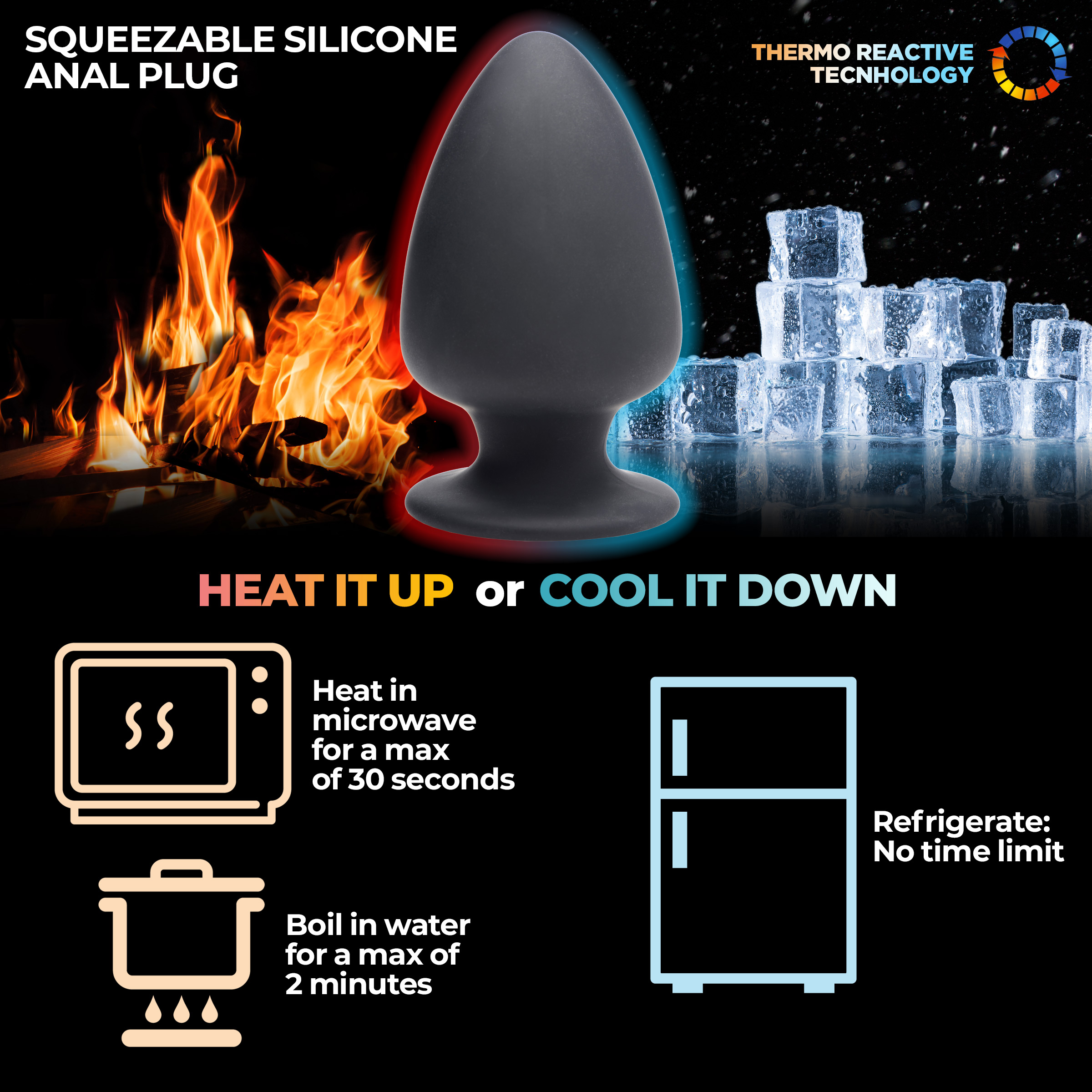 Available in 3 sizes, this squeezable, bendable butt plug makes insertion easy and fun! This state-of-the-art anal accessory is ultra-flexible so that it can conform to your demands. Enjoy the classic spade shape with its wide bulb, or squish it into a more tapered design that slides in with ease. Made with Thermo-Reactive Technology, it can be cooled down in a refrigerator until you are ready to use it, making it chill and hard, or it can be heated in a microwave or boiling water to make it warm and comfortably pliable. Suction down the base to a smooth surface for a hands-free penetration. The premium silicone material is non-porous and phthalate-free, but not compatible with silicone lubricants. Clean after use with mild soap or toy cleaner. Made with a patented revolutionary formula for a realistic feel.