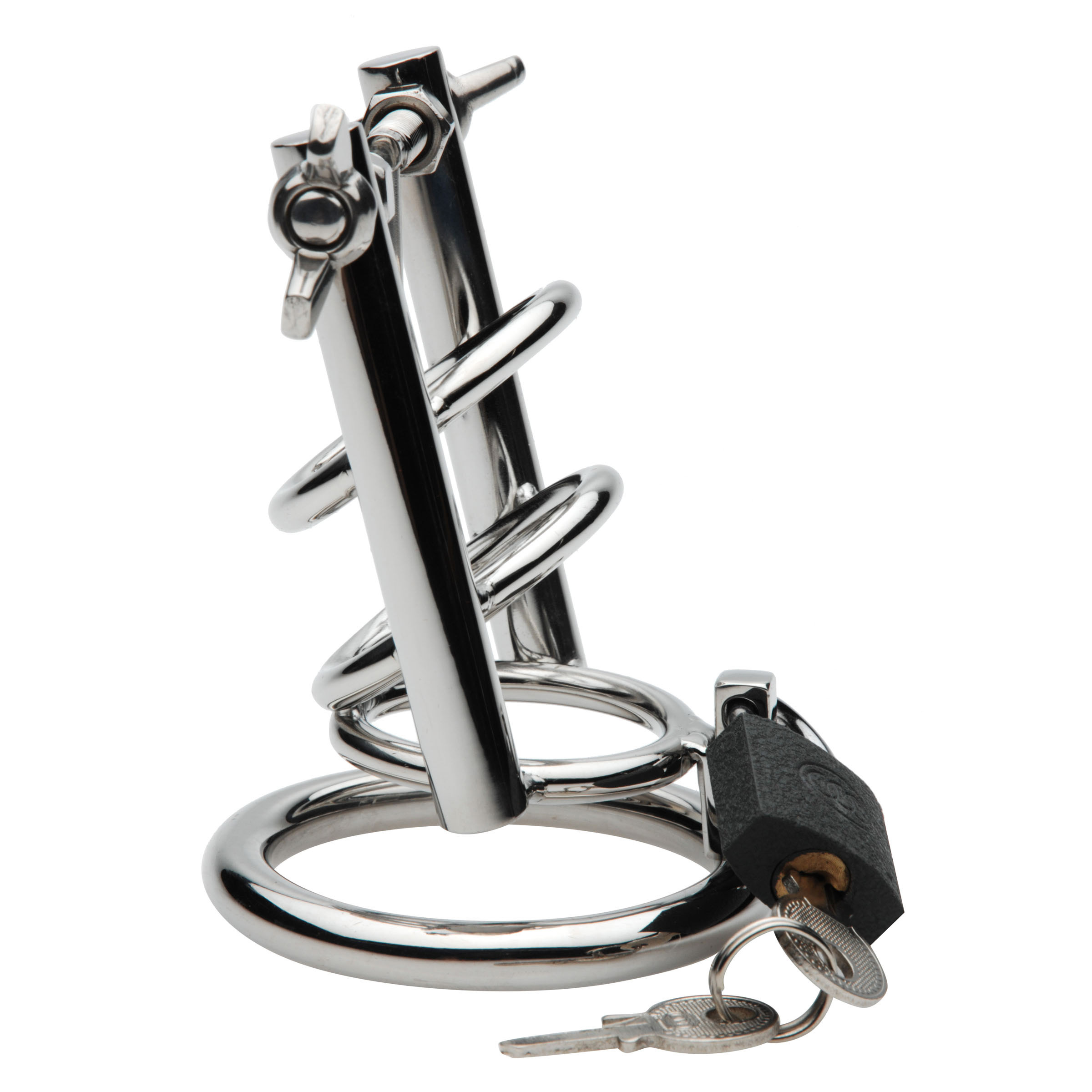 Delve into a world of pleasure and pain with this extreme CBT chastity cage that will take you to the limits of what you can endure. The two slim, smooth arms are designed to be inserted deep into the urethra, as you lock the ring around the base of the cock and balls. With every twist of the wing nut, the arms spread further and further apart, stretching the urethral opening wide open and leaving you gaping. Sized to be used even if you are flaccid, the three shaft rings will keep your cock steady as you are forcibly dilated. For safety, the urethral spreading arms are able to be closed by the wearer.