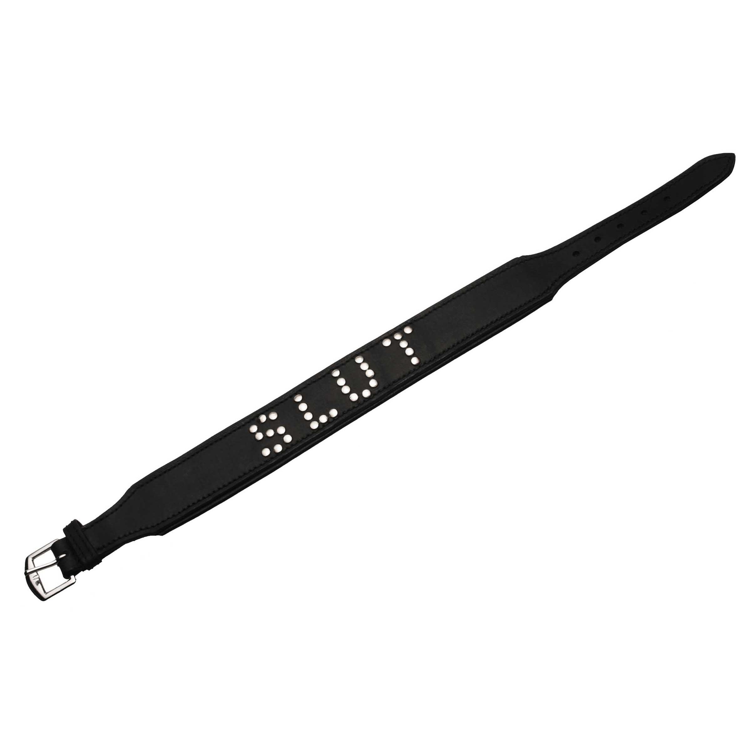 Mark your property or make a statement with this ultra luxe, quality leather collar. The word SLUT is spelled out in shining silver studs, and the double layered leather has an extra layer of padding in the front for comfort. The collar closes in the back with a buckle, and is adjustable to fit necks between 14.5 and 17.25 inches.