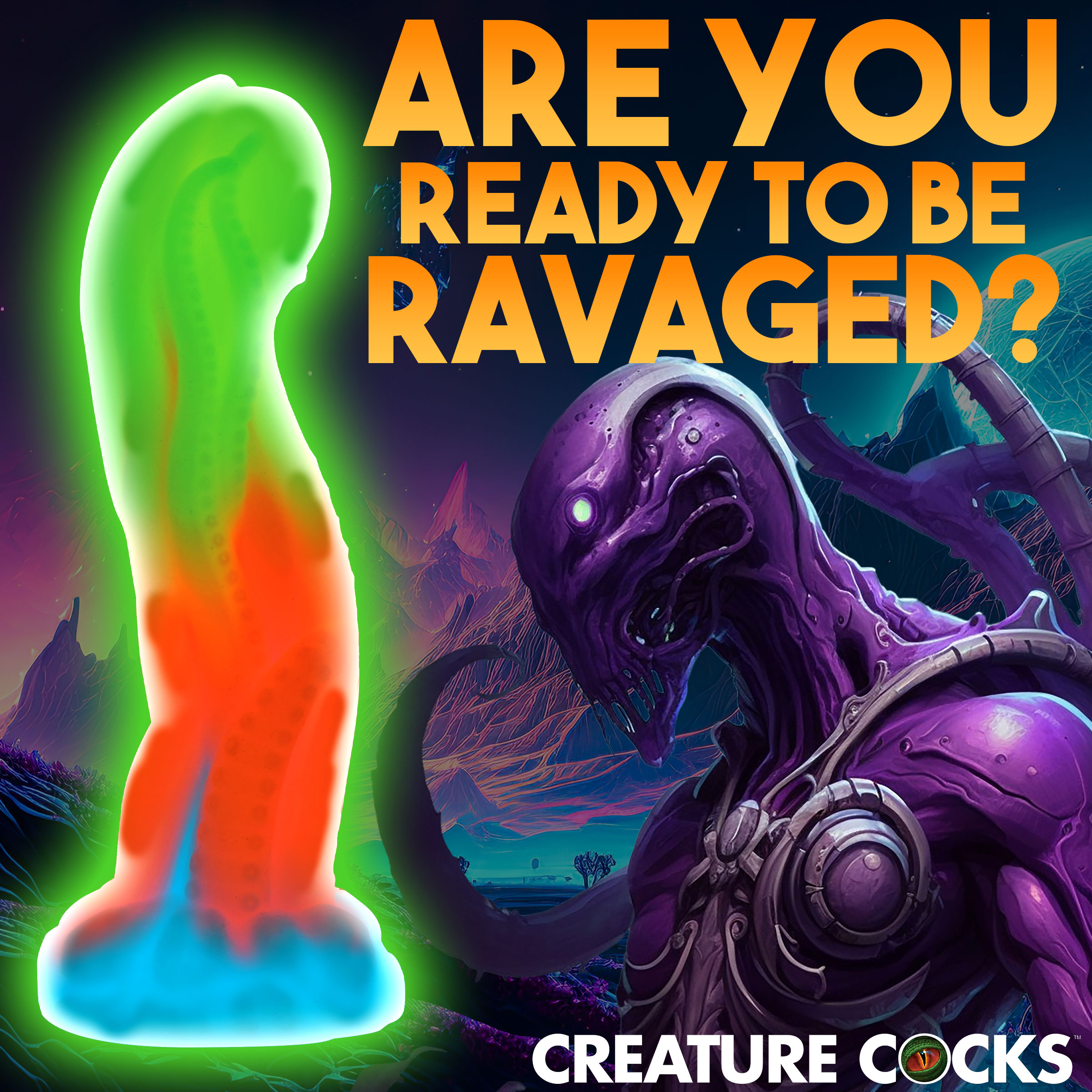 Take your fantasy roleplay, kinky cosplay or creative role play further with tangible fantasy toys from Creature Cocks! This Glow-In-The-Dark Tentacle Dildo might just be the perfect toy to hit every deep spot within you, light up the night, and excite you and your partner! From the light blue base the tangle of thin tentacles reach up towards the round, egg-shaped orb that they hold. Each ropey tentacle is either smooth or textured with little suckers that will massage you and add unique shapes to the shaft. The round egg at the tip helps to massage your P-spot or G-spot and add extra pleasure! Expose it to sunlight or UV light so that it glows neon blue, orange and green in the dark! The wide base provides powerful suction so you can go hands-free by placing it on any flat surface to keep it in place. You can also combine it with a compatible strapon harness for pegging play! Made out of premium, phthalate-free silicone, it has a firm core and soft, silky surface. Use only with water-based lubricants for best results. After play is over, wash the dildo with warm water and soap and use a toy cleaner to spray clean. Wipe dry and store in a cool, dark place out of direct sunlight.