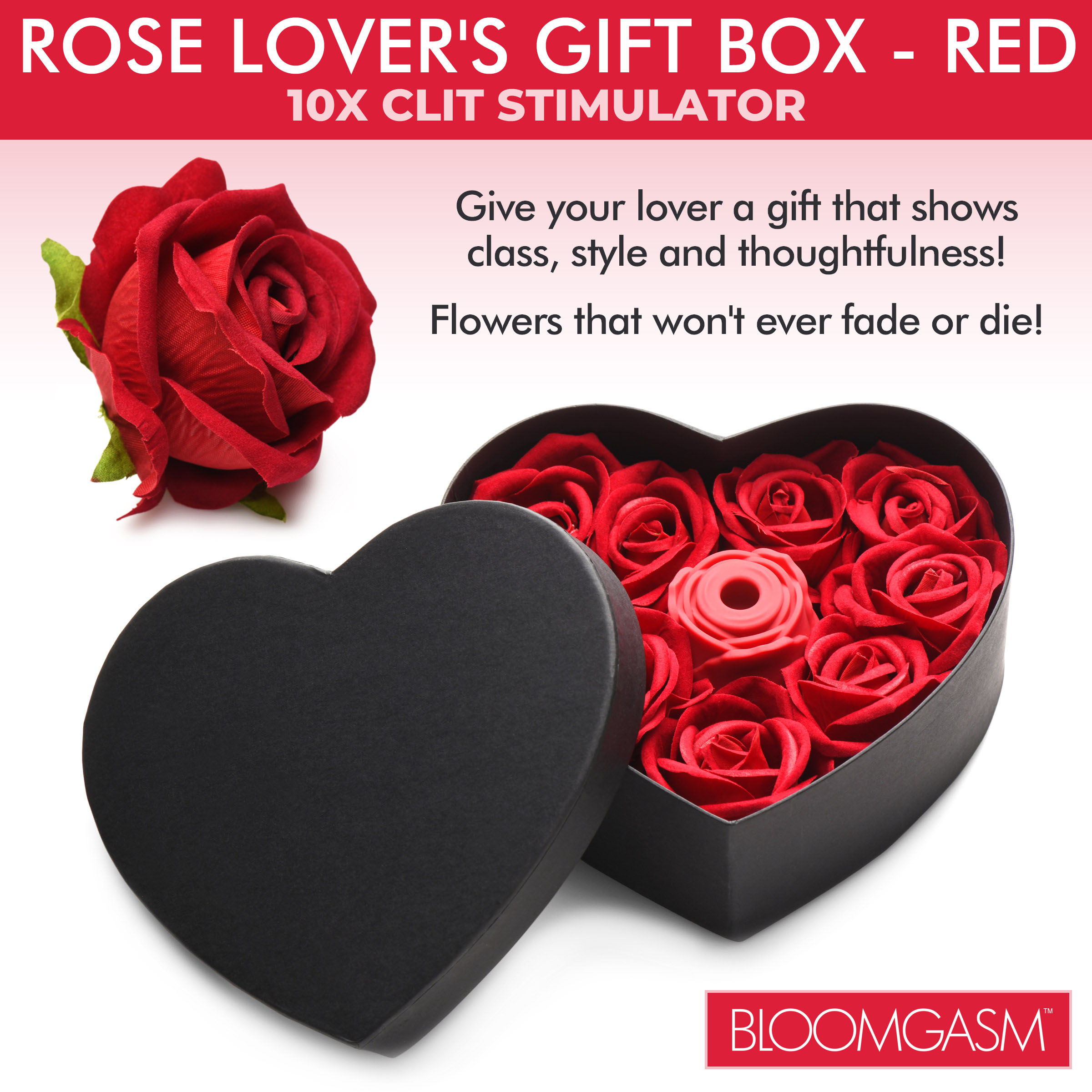 Blooming Rose Sucker: This powerful air-stim clit sucker has 3 intensity levels and 7 patterns of suction!Gift Wrapped in Roses: Show them you love them with style and class! Packaged in a heart-shape box with polyester flowers that won't ever fade or die!Premium Waterproof Silicone: This phthalate-free, premium silicone is also waterproof! Take it in the bath for up to 30 minutes or in the shower for even longer!Rechargeable with Base: Use the magnetic charging base to pose your rose upright while it charges!