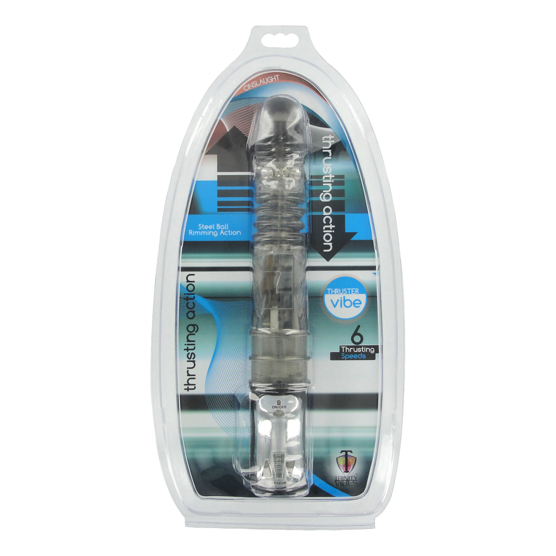Introducing the revolutionary Thruster Sex Stick Expertly designed for anal play, this magnificent piece boasts a powerful motor that extends throughout the shaft. You can even see it working Non-jamming metal beads rotate at the top, coupled with a unique thrusting action for the push and pull of anal play. All this while the shaft is moving up and down and the head takes it up a notch by rotating in a semi-circular motion This toy is a must-have for anyone interested in taking anal play to a whole new level. Measurements: 11.5 inch overall length, 8.25 inch insertable length, 1.85 inch max insertable diameter, Material: TPR, ABS, Color: Smoke, Note: Requires 4 AA batteries, not included