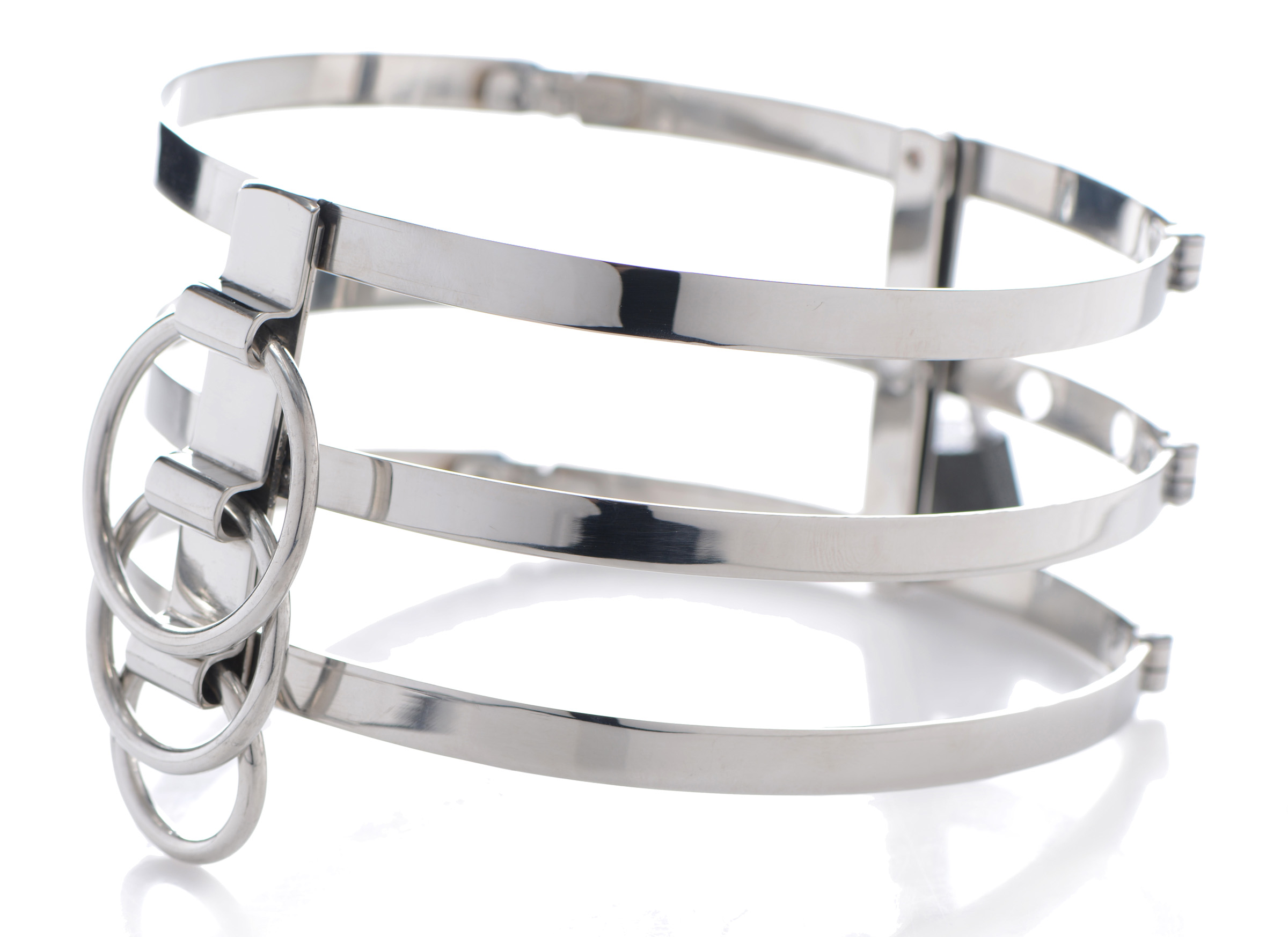Sturdy and strong, this stainless steel locking collar rests on the collar of your lover, caging their neck without applying direct pressure. The three ring cage features three individual rings on the front for attachment of leashes, chains, or other restraints!