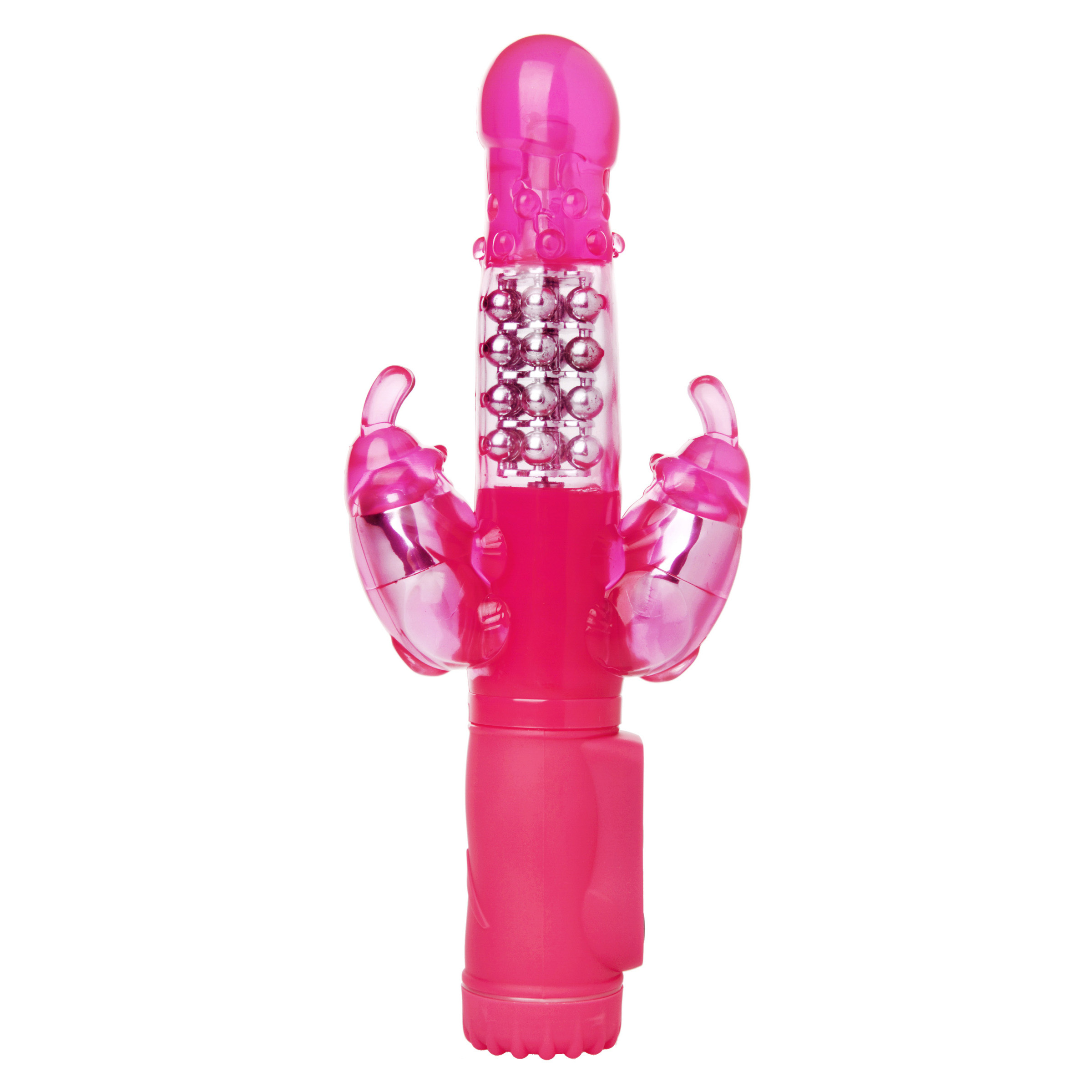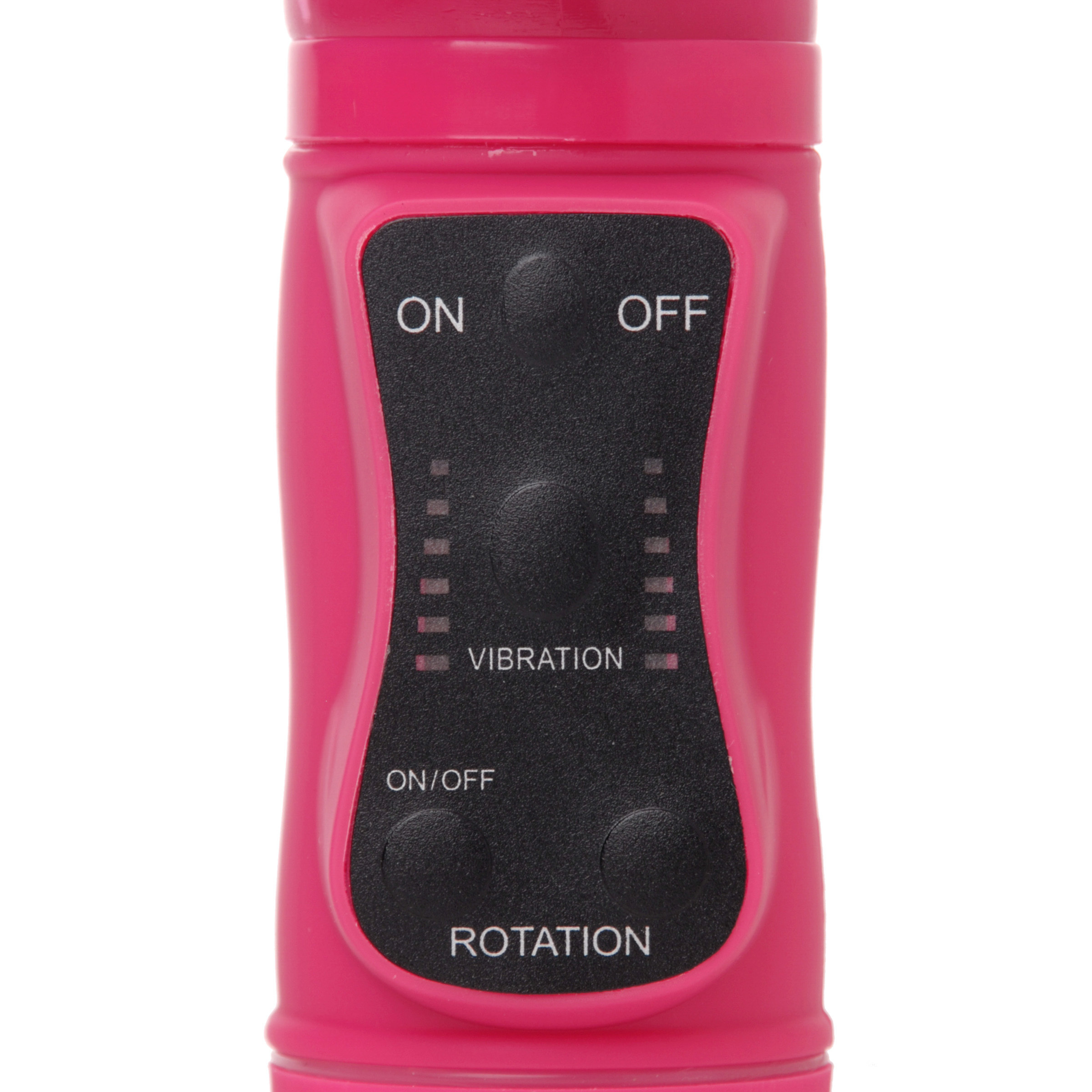 With the Trinity Triple Pleasure Rabbit Vibe, you get not one, not two, but three ways to pleasure yourself, all at the same time! This unique rabbit style vibe features a five inch insertable shaft, with a textured tip plug two powerful bunnies to tickle your clit, as well as your bum. The amply sized rotating beads inside the shaft will move in sync with the vibration pattern you select, offering a whole lot of orgasmic sensation. The control panel is easy to use and is integrated into the front of the rabbit, so there are no wires or remotes to mess with. You can control both the vibration and rotation modes at the same time, or use them separately. There are 6 rhythmic modes of vibration and 6 speeds of rotation. Splash proof for wet and wild fun!