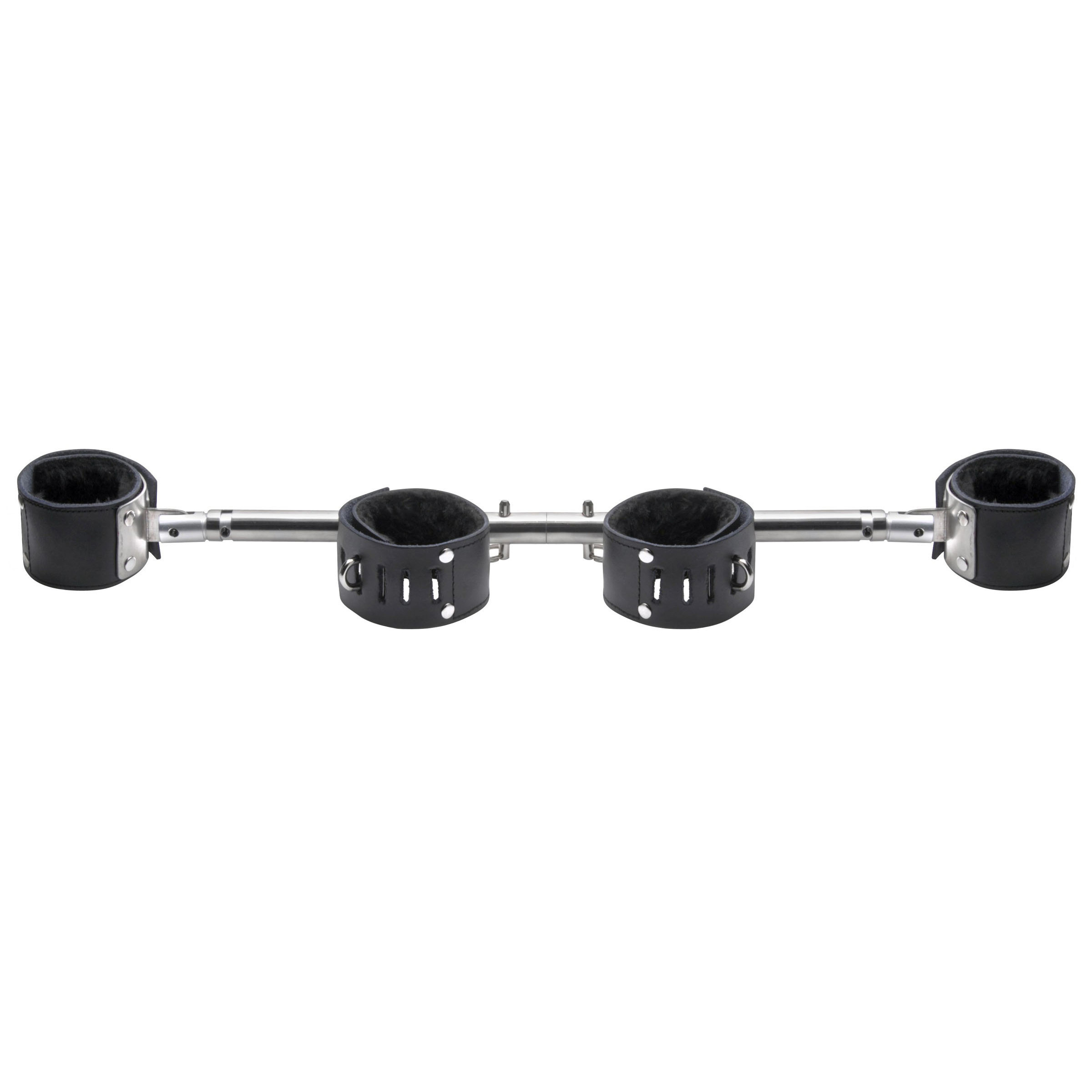 Secure their wrists and ankles and grant yourself unrestricted access to their mouth with this simple yet highly effective bondage kit. The cuffs are secured permanently to the bar, with swiveling hinges and a secure build. The leather wrapped ring gag fits behind their teeth, holding their mouth open and exposing them completely to you. The adjustable leather strap has a sliding D-ring closure, for a secure fit on every size.