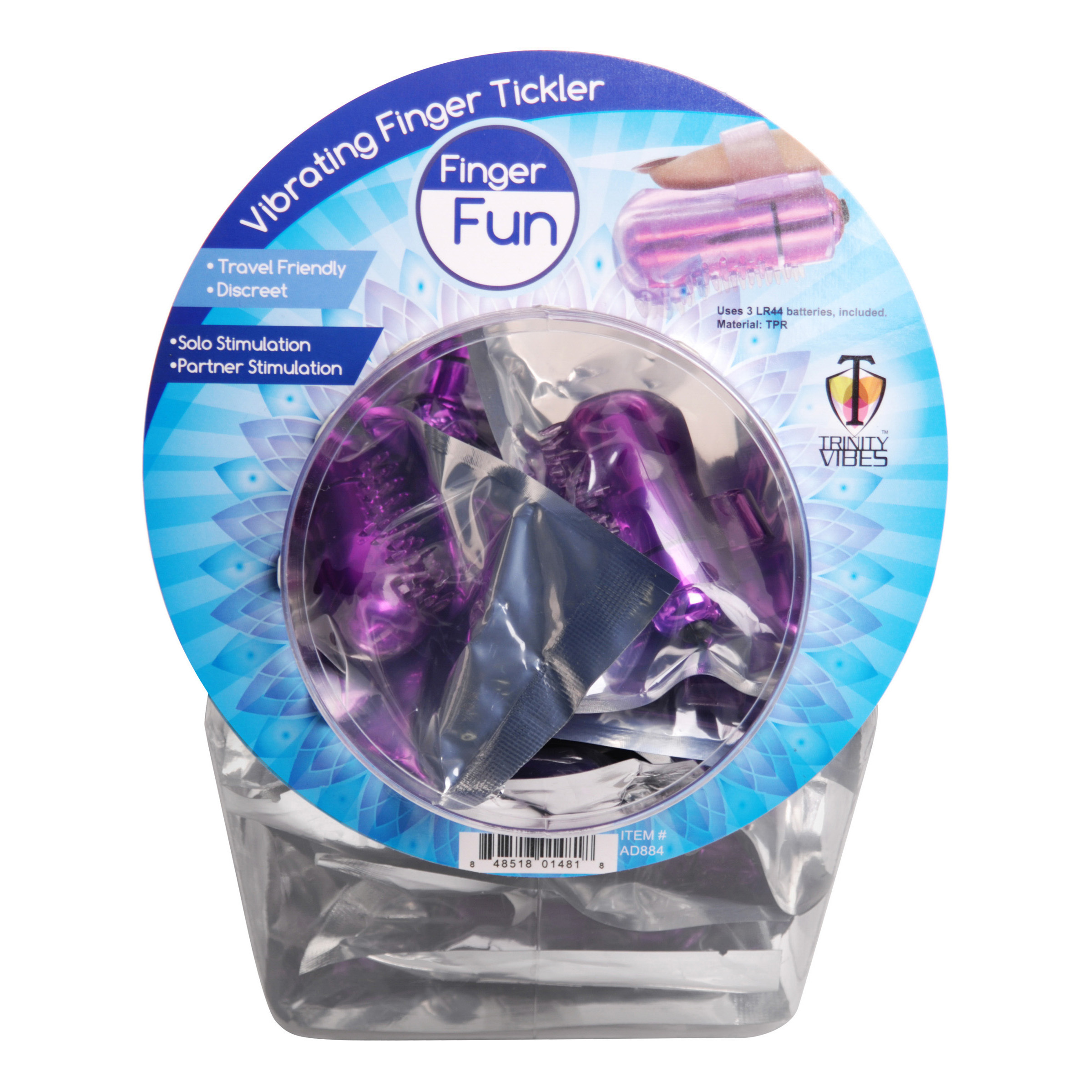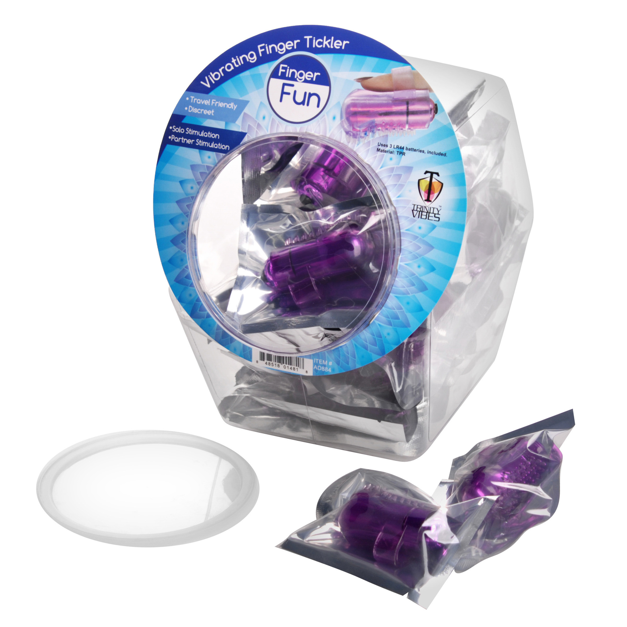 This fishbowl is ideal for countertop display, making it exceptionally easy for anyone to get their hands on thrilling fingertip vibration. The 30 piece bowl contains foil wrapped vibrating bullets, with a loop of rubber that lets you slip them easily onto a fingertip for pinpoint pleasure. The bullet is coated with soft jelly rubber studded with exciting textures, and features a simple push button switch for simple yet satisfying play. Each packet has a notched top, making it easy to open, and each are labeled for individual sale. Material: Plastic. Color: Purple. Note: Contains 30 individually sealed vibrating finger ticklers. Requires 3 LR44 tab batteries each, included