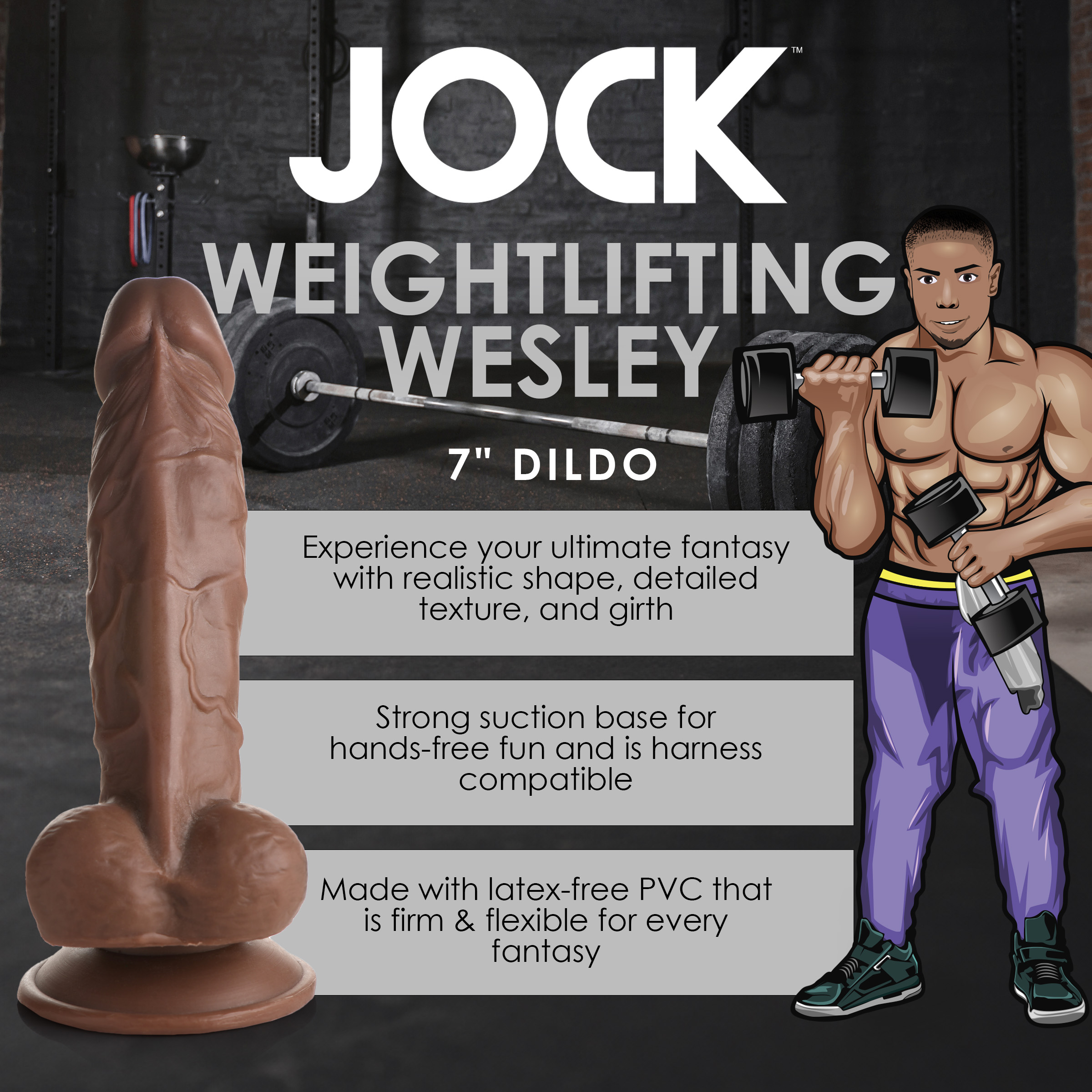 You yearn for something to fill you up, so you grab your Weightlifting Wesley dildo and some lube. As you place the dildo against a flat surface, you free up your hands to play with yourself as you bounce on top of it and ride it! Changing angles, you place it against a wall and pound it in Doggy Style! Invite your partner and bring some vibrators into the mix too and you'll be upping your pleasure gains in no time!